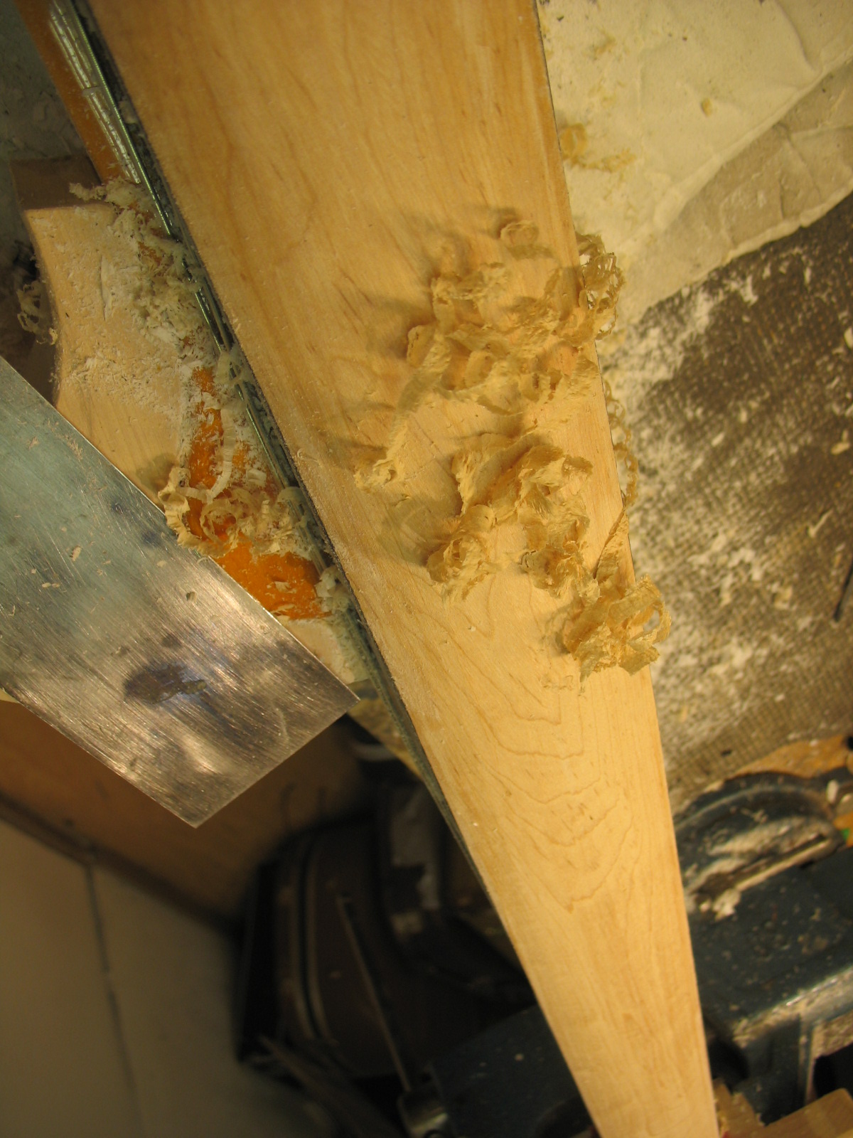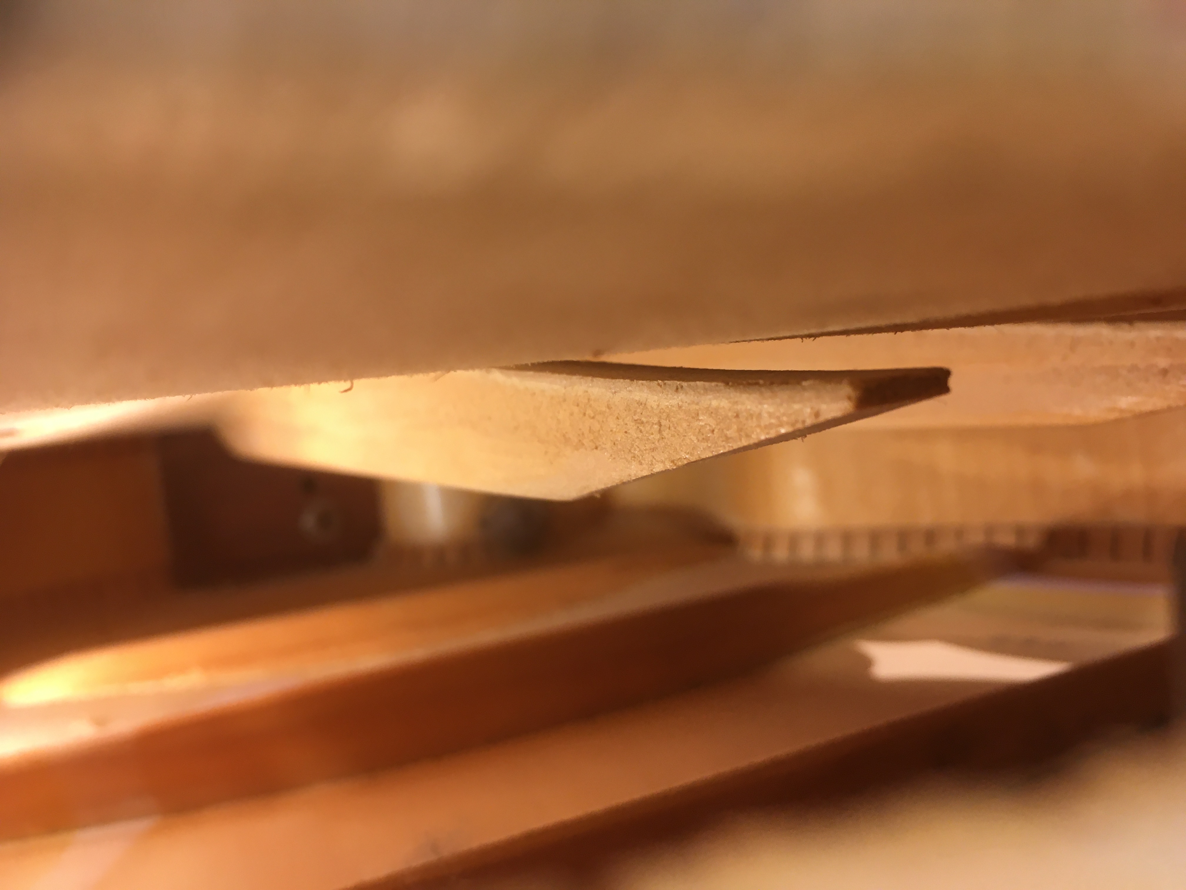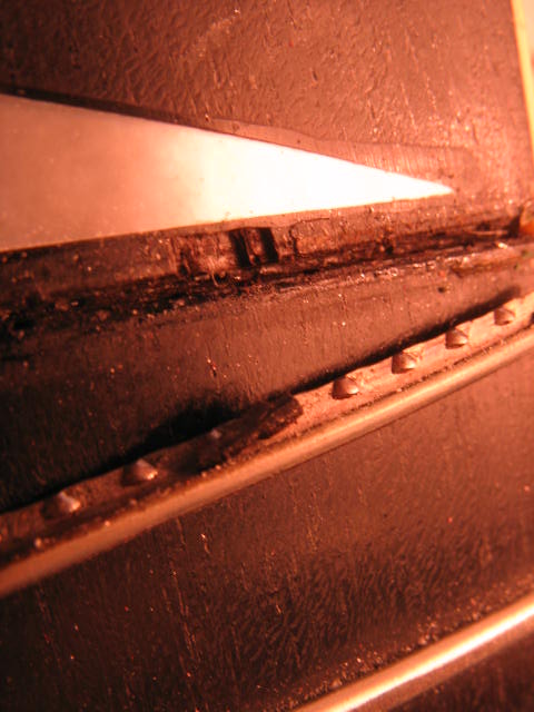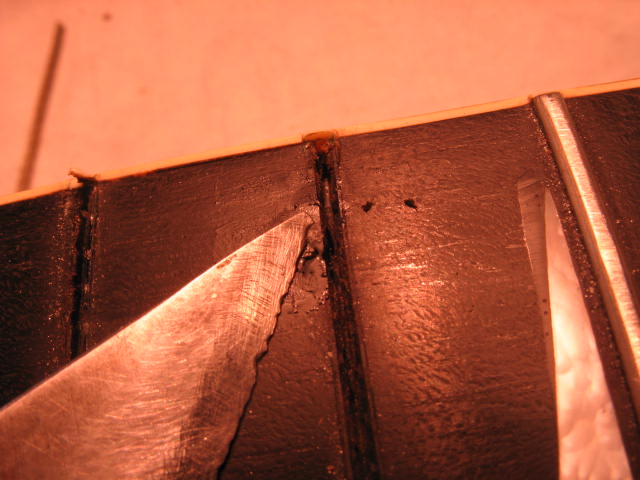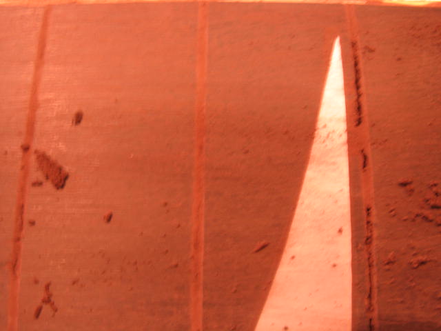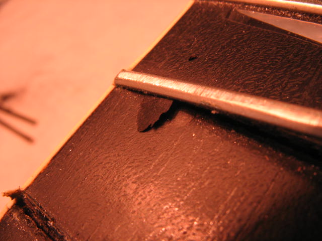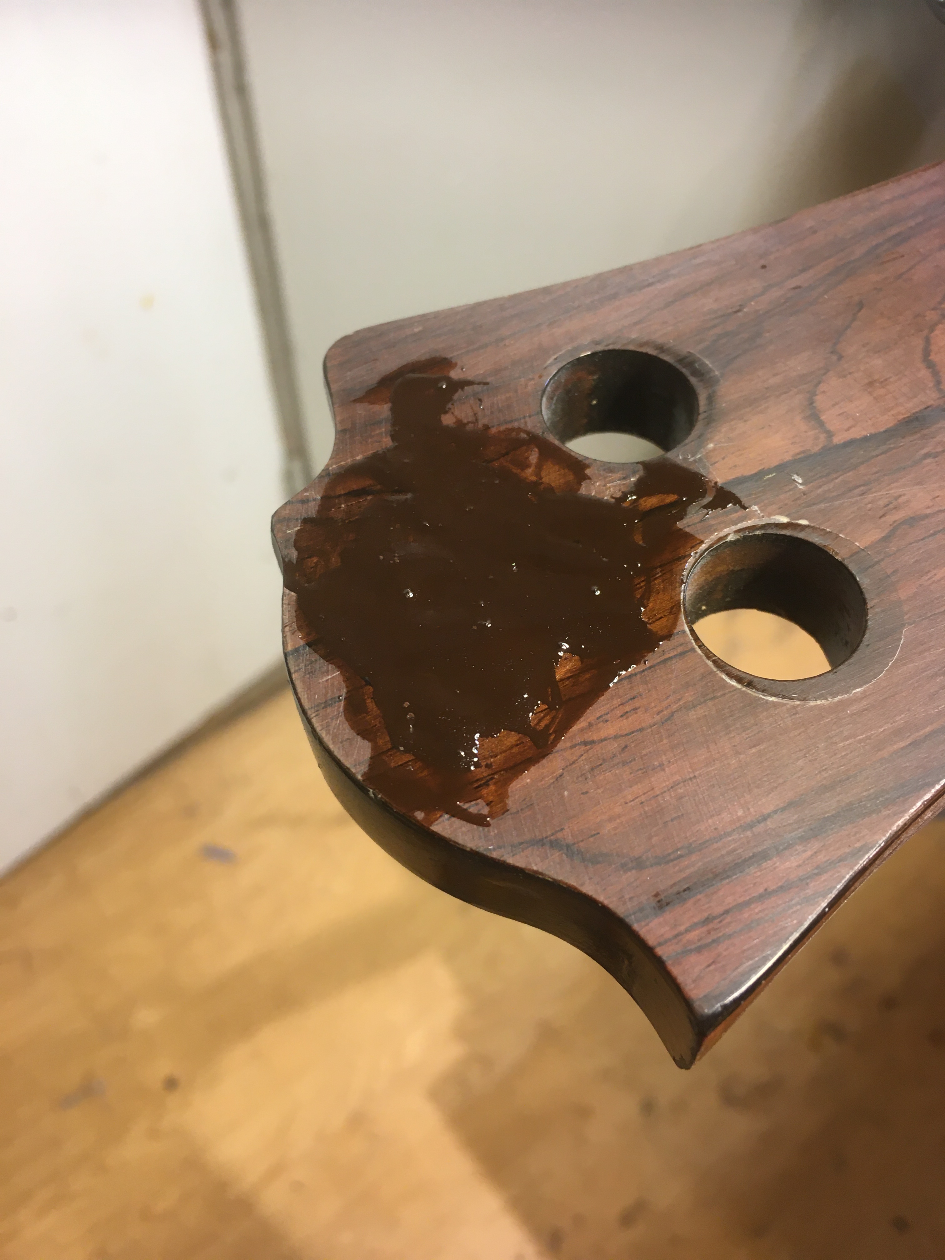 Tässä kuvassa näkyy kolhu joka on puuhun asti, punaista väriä on tarttunut puuhun kun maalia poistettiin. Pohjalakka on todella paksu kerros polyesterlakkaa.