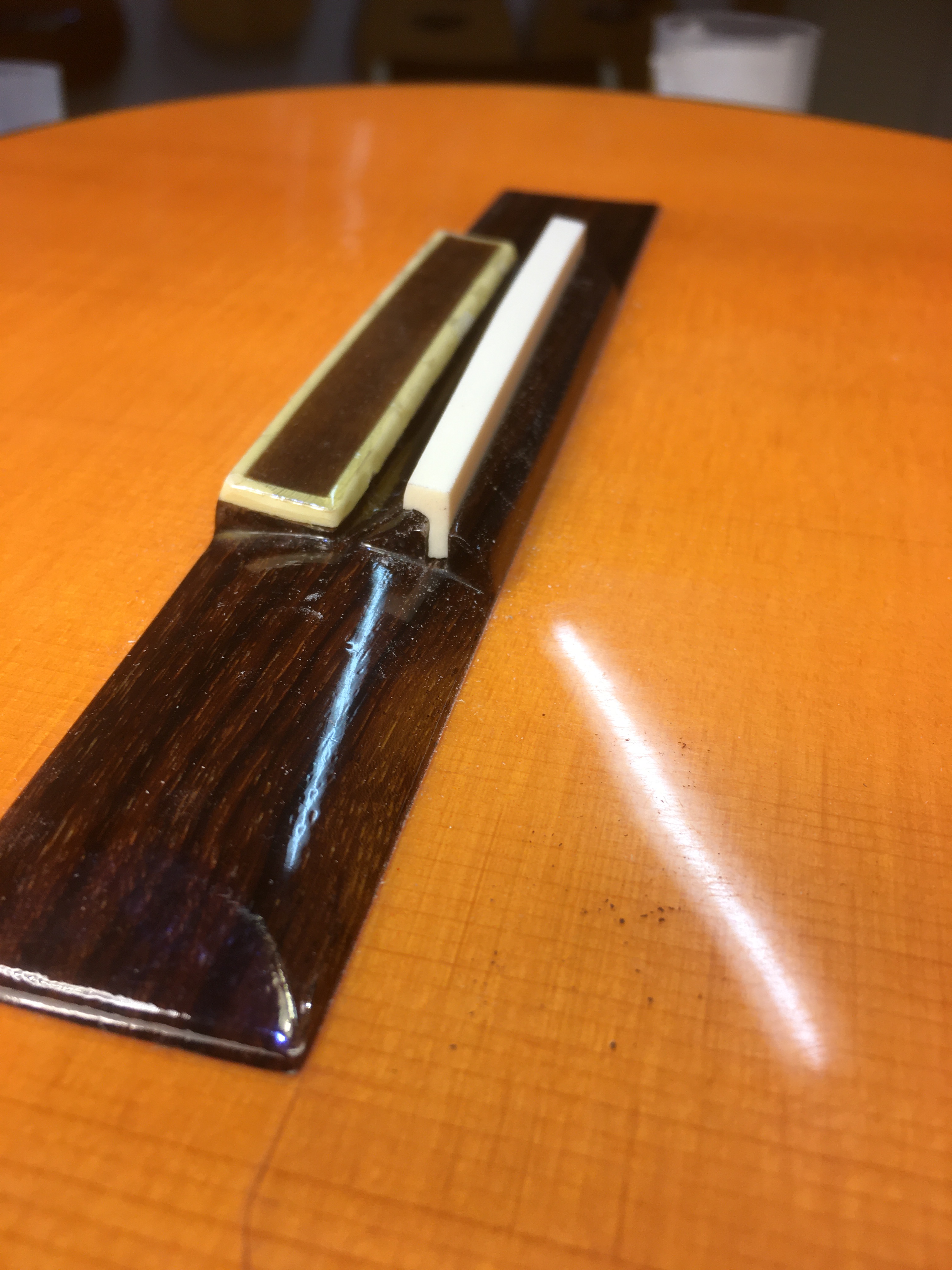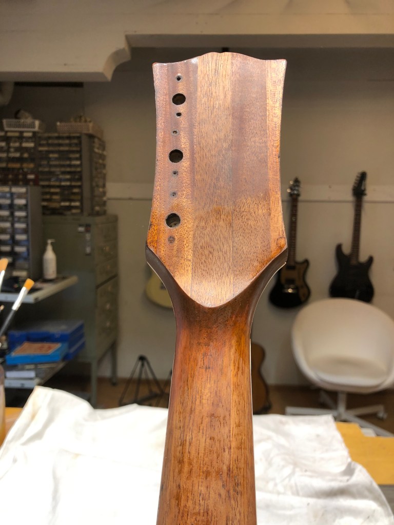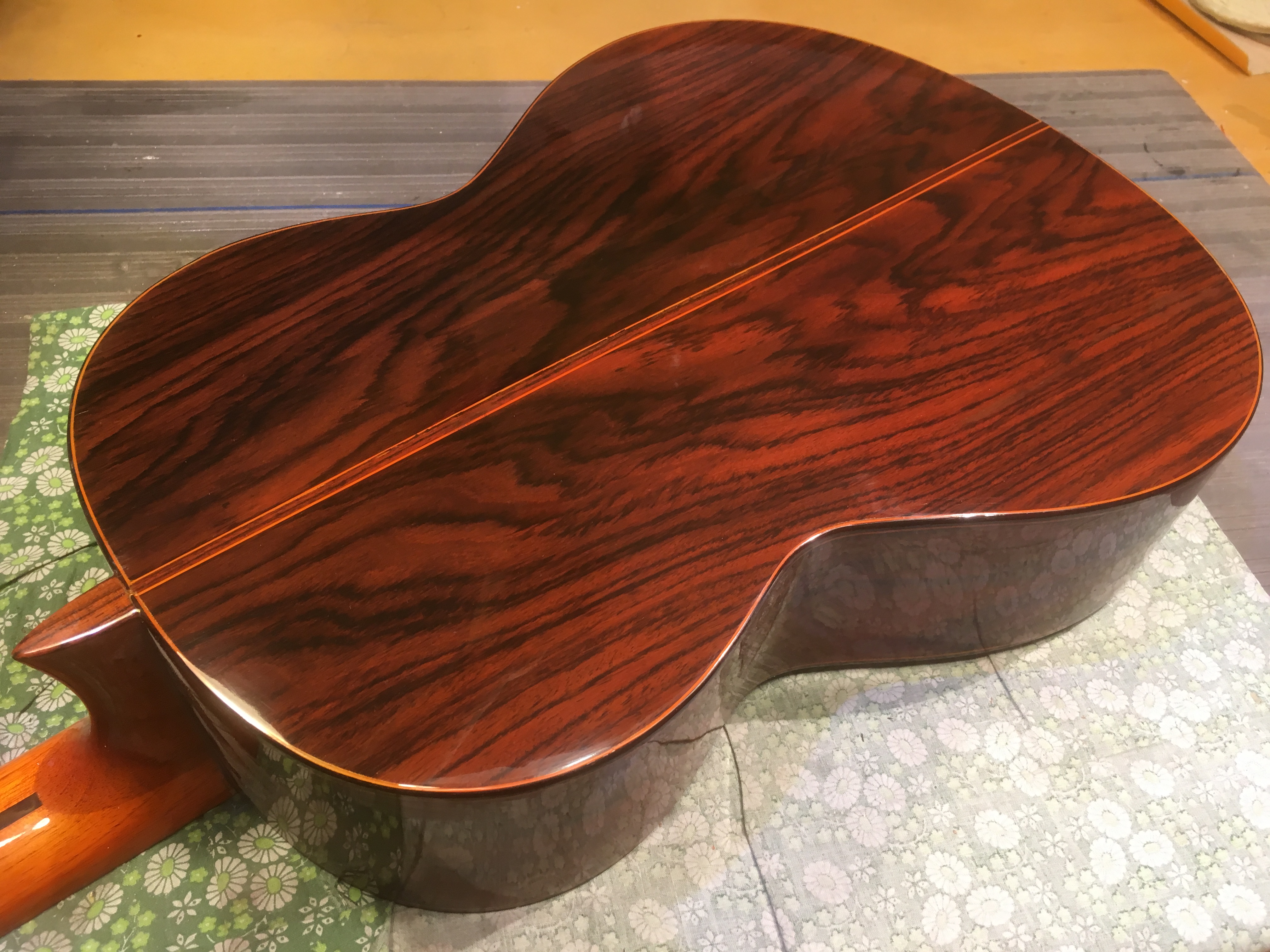 Maalin päälle ruiskutettiin 5 kerrosta polyuretaanilakkaa. Lakka ei ole välttämätöntä, mutta suojaa kitaraa sekä tuo lisää kiiltoa. Viimeisen lakkakerroksen kuivuttua alkaa varsinainen työ.