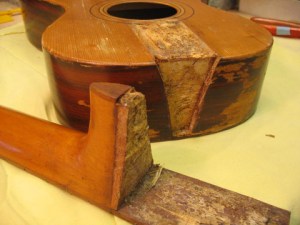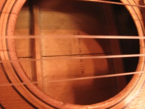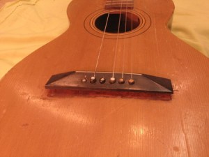 Tämä Levin-kitara vuodelta 1924 oli päässyt aika huonoon kuntoon. Talla oli irronnut jo