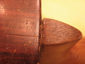 Vaahteralista liimattuna paikoilleen. Liimauksen jälkeen lista työstettiin pinnän tasolle ja värjättiin öljyväreillä.
