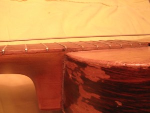 Sen seurauksena kielet olivat aivan liian korkealla. Pohja sivut olivat vaahteraa tai koivua joka oli ootrattu ruusupuun väriseksi. Väri oli lohkeillut.