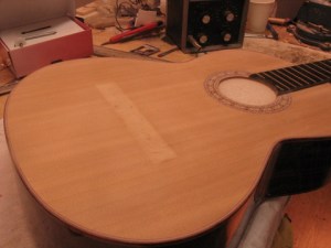 Yairi- kitaran kansi oli aikoinaan halkeillut ja sitä oli yritetty korjata huonolla menestyksellä.
