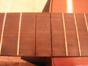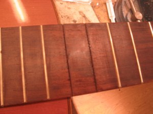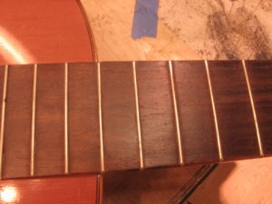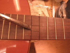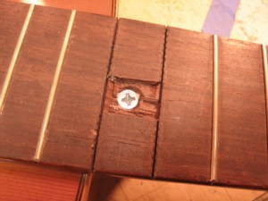 Tässä halpiskitarassa oli kaula murtunut koron kohdalta. Koska tähän kohtaan kohdistuu aika kova vääntö, oli aiheellista vahvistaa sauma liimauksen jälkeen ruuvilla. Ruuvi voidaa laittaa joko korkolapun alle tai otelaudan läpi. Tässä tapauksessa se laitettiin otelaudan läpi.