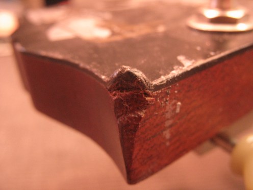 Tämä Gibson LP oli irronnut hihnasta ja pudonnut päälleen. Kaula ei ollut mennyt poikki mutta lavan kulmaan oli tullut kolhu.