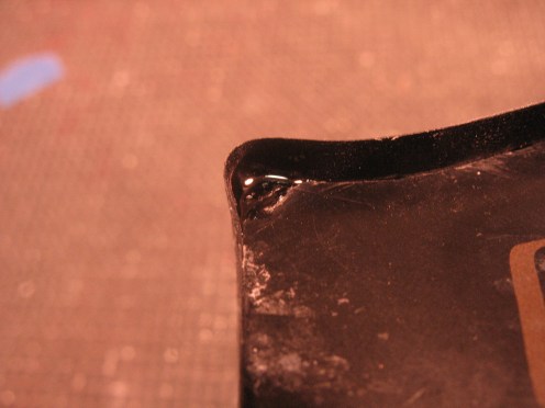 Kuitulevy ei turvonnut niin paljon kuin puu. Kulmaan lisättiin mustaa epoksia. Myös mahonkiosaan lisättiin vähän ruskeaa epoksia.