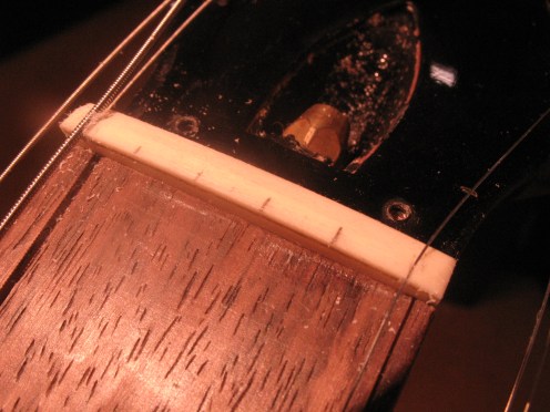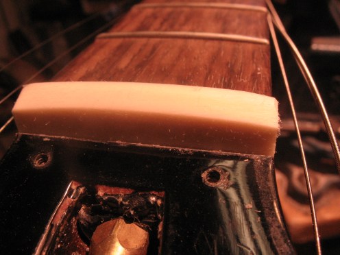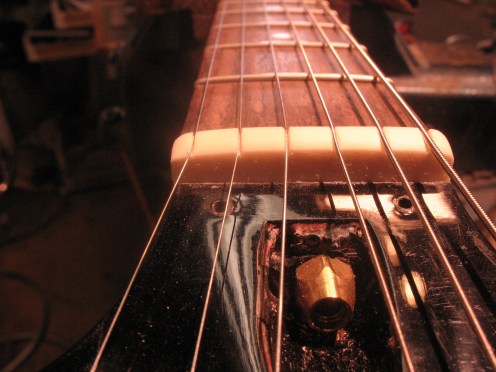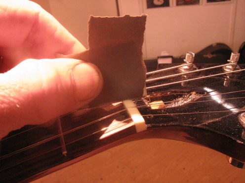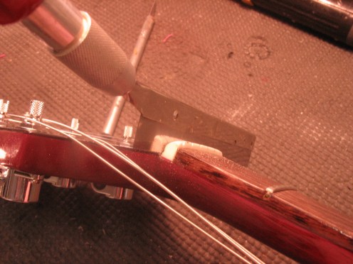 Tyypillinen ongelma GIBSONIN sähkökitaroissa on se, etteivät ne pysy vireessä. Tämä johtuu liian jyrkästä lapakulmasta ja siitä, ettei kielen linja mene suoraan satulan yli vaan kääntyy sivullepäin. Ongelma saadaan yleensä korjattua vaihtamalla yläsatula liukkaampaan materiaaliin. SLIPSTONE on osoittautunut hyväksi, se on erittäin liukas eikä vaikuta soundiin huonontavasti. Tässä on työn alla GIBSON FLYIN’ V. Gibsonin tehtaalla satula asennetaan ennen lakkausta, joten satulaa irrottaessa on oltava tarkkana, ettei lakka lohkeile. Satulan päädyssä olevaa lakkaa lämmitetään kuumailmapuhaltimella, jonka jälkeen leikataan terävällä veitsellä satulan reunoja pitkin. Kuten kuvasta näkyy, niin värillinen lakka ulottuu osittain satulan päälle.