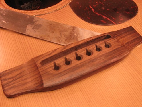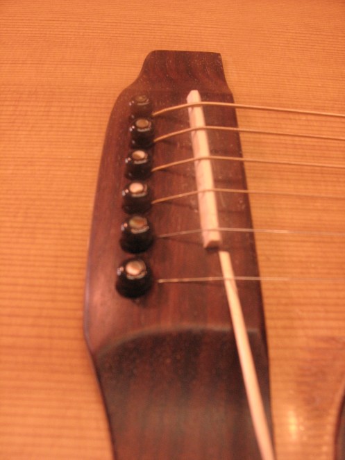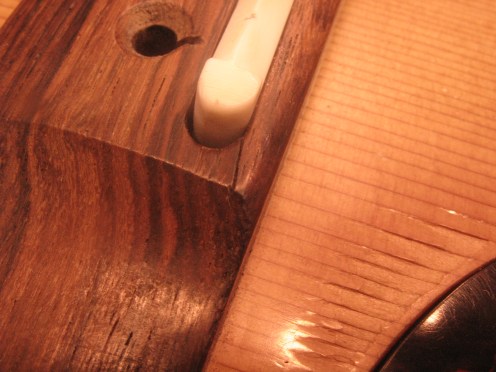 Tässä K.YAIRI -kitarassa tallanastojen reiät oli alunperinkin porattu liian lähelle satulan uraa. Liian syvät kielien urat vielä pahentavat tilannetta. Puu on murtunut reiän ja satulan uran välillä.