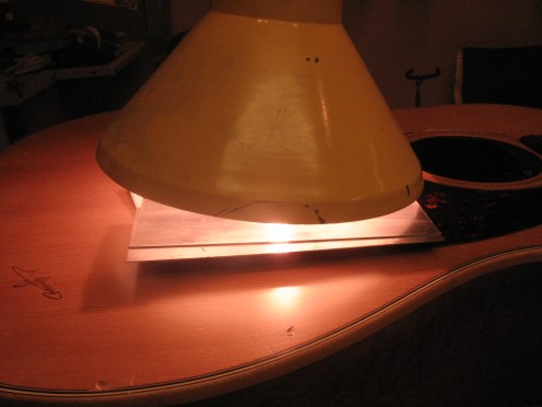 Tavoitteena on saada liima pehmiämään hieman. Kannen sisäpuolelta kun koettaa kädellä niin pitää olla selvästi yli kädenlämmön. 75w hehkulampulla puolituntia riittää pehmittämään liiman (jos hehkulamppuja vielä löytää jostain.