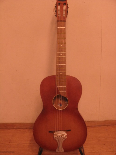 Tämä vanha Westerlund-merkkinen kitara tuli huoltoon kysymyksellä:  ”saisikohan tästä jotain?”  Kaula oli  jo melkein irti, se irrotettiin kokonaan ja liimattiin uudestaan oikeaan kulmaan Nauhoille tehtiin pikahionta ja säädöt katsottiin kohdalleen.  Tälläiset poikittaisrimoitetut pikkukitarat ovat säädettyinä mainioita soittimia akustiseen bluesmeininkiin.  Jos joku pitää Robert Johnsonista niin kannattaa hankkia tämäntyyppinen soitin.