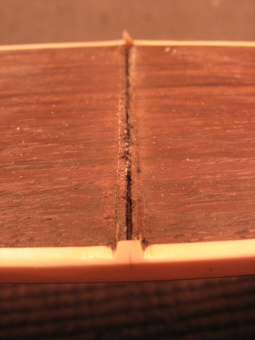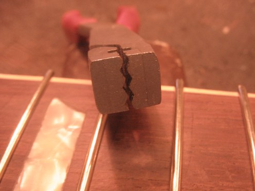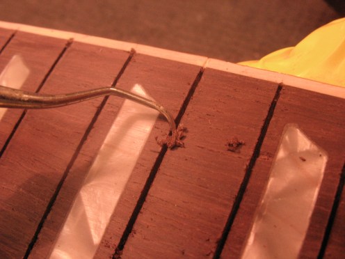 Nauhat poistetaan. Gibson laittaa puuliimaa nauhojen uriin nauhoittamisen yhteydessä, se täytyy saada pois ennen kuin uudet nauhat voidaan asentaa.