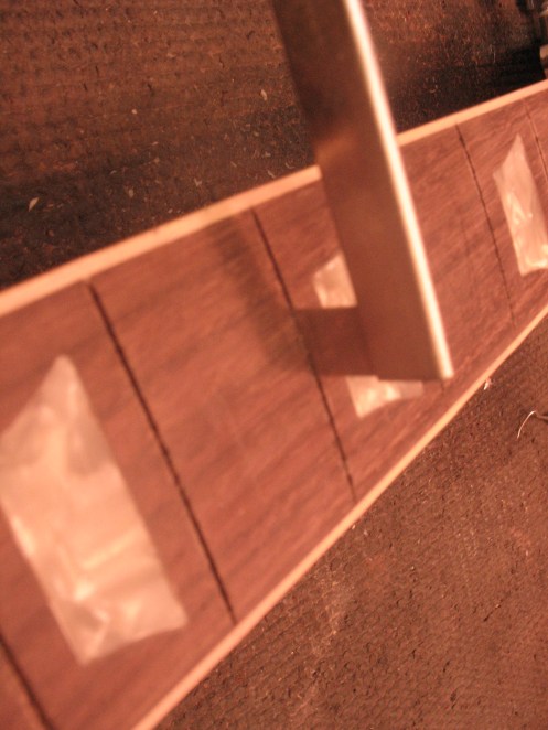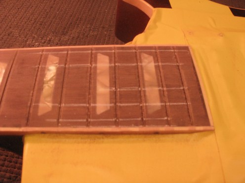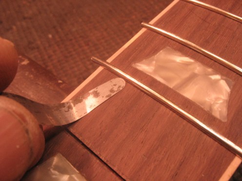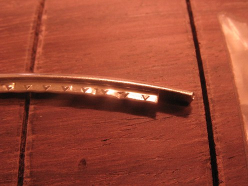 Nauhojen alle imeytetään hieman vedenohutta pikaliimaa ja ylimääräinen pyyhitään pois asetoniin kastetulla pumpulipuikolla. Ylimääräiset nauhanpäät katkaistaan, nauhanpäihin viilataan viiste, terävät kulmat pyöristetään. Nauhat hiotaan ja kiillotetaan. Lopputulos näyttää tältä.