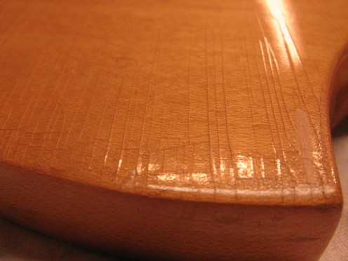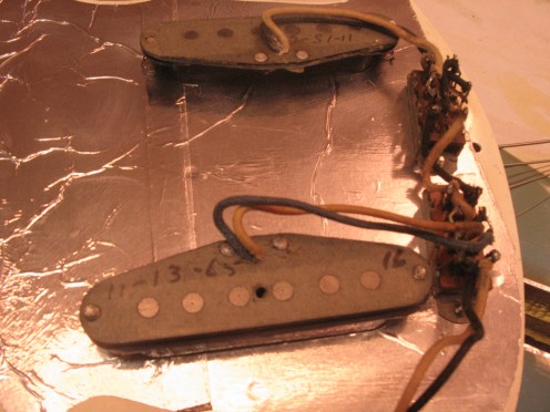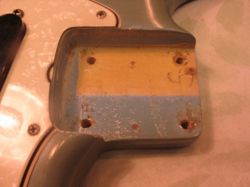 Kaulataskussa näkyy jäljet kiinityskepistä, jossa kitara on ollut kiinni maalauksen ja lakkauksen aikana. Alimmaisena näkyy keltainen pohjaväri, tästä kitarasta on ehkä alunperin pitänyt tulla sunburst? Alkuperäinen sininen väri on säilynyt melko hyvin kaulan alla.