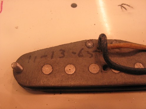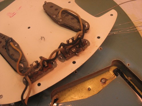 Tämä Fender Mustang vuodelta 1965 tuli nauhojen vaihtoon ja häiriösuojaukseen. Väri on ilmeisesti alunperin ollut Daphne Blue, nyttemmin selluloosalakan kellastumisen johdosta ennemminkin oliivinvihreä…