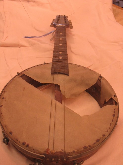 Tämä vanha mandolinibanjo oli päässyt huonoon kuntoon. Kalvo oli rikki, kalvon kiristimiä puuttui, otelauta oli kiero, nauhat olivat enimmäkseen irti ja lavassa oli halkeama.