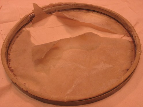 Aliksi soitin purettiin osiin. Uusi kalvo tehtiin poronnahasta, joka tilattiin Kemin Nahkatarvikkeesta. Kalvoa liotetaan vedessä niin että se pehmenee. Pehmennyt kalvo kierretään kehyksen reunan ympärille ja annetaan kuivua.