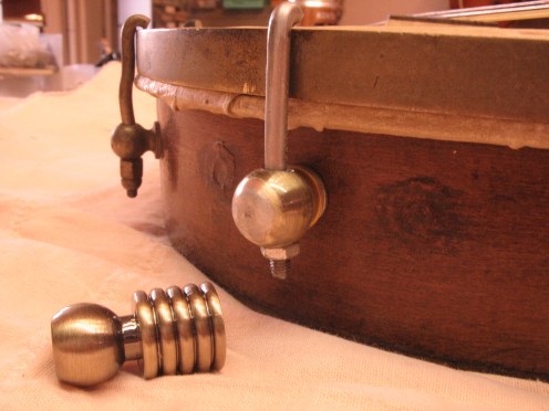Joskus puuttuvia osia joutuu improvisoimaan. Puuttuvat kalvon kiristimet valmistettiin rautakaupasta löytyneestä nupista/vetimestä ja 4mm akseliteräksestä. Nuppi sahattiin poikki ja siihen tehtiin reikä. Akseliteräkseen tehtin kierteet ja se taivutettiin sopivan muotoiseksi.