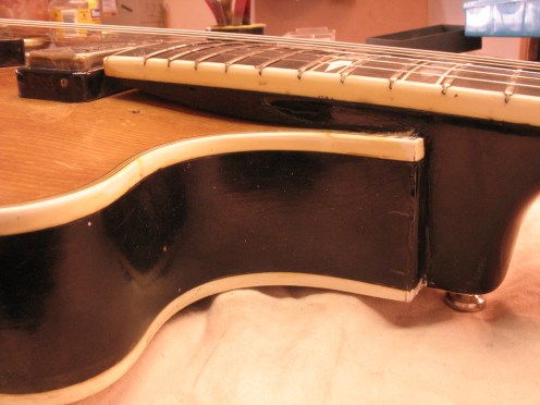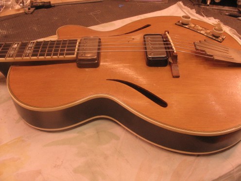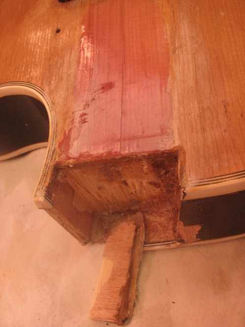 Pitkällisen höyryttämisen jälkeen kaula lähti irti, rungosta irtosi myös paloja. Kannesta, otelaudan alta paljastui punaruskea lakka, ilmeisesti kitaran väri oli alunperin ollut sunburst, kaulan liimauksen jälkeen väri oli kuitenkin hiottu pois ja lakattu kirkkaalla lakalla.