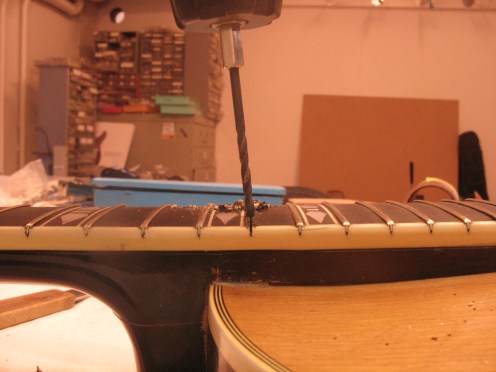 Tämä kitara oli surullinen esimerkki ”tein itse ja säästin” -korjauksesta. Murtunut kaula oli liimattu epoksilla väärään asentoon.