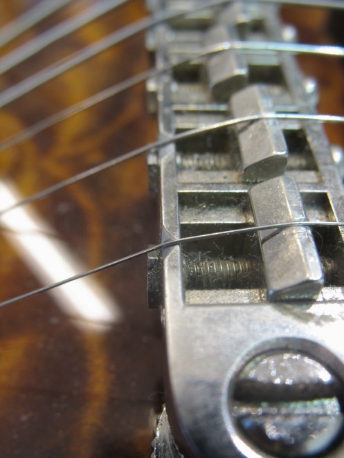 Jos kielen kulma tallassa on liian suuri, kieli ottaa kiinni tallan lisäksi myös tallan runkoon. Tämä aiheuttaa helposti vireongelmia, kitara ei pysy vireessä. Tämän ESP HORIZONin tallaan viilattiin pyöristykset niihin kohtiin missä kieli koski tallaan.