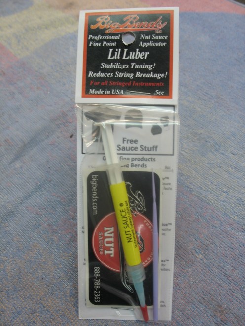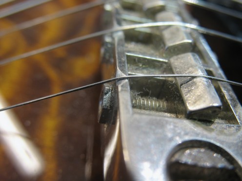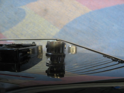 … ja voideltiin teflonilla. Tallapalojen  ja yläsatulan urat käsiteltiin samalla tavalla. Näiden toimenpiteiden jälkeen kitara pysyi jälleen vireessä kovassakin soitossa.