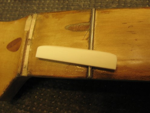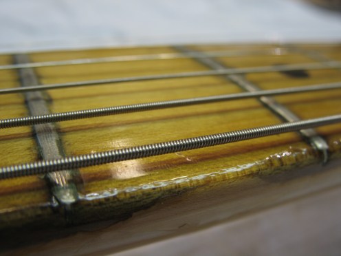 Valmis kitara. Korjauksessa pyrittiin säilyttämään mahdollisimman tarkkaan soittimen kulunut ulkonäkö ja silti saada soitettavuudesta erinomainen. Kielet säädettiin matalalle asiakkaan pyynnöstä, lopullinen korkeus 12. nauhalla oli 1,0 mm – 1,5 mm (e-E).