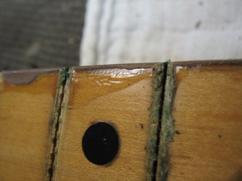 Otelaudasta ajan myötä lohkeillutta lakkaa oli jossain vaiheessa korjailtu selluloosalakalla. Paikka erottuu alkuperäisestä lakasta tummenpana.