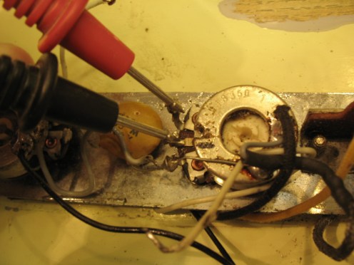 Tämänikäisissä kitaroissa kannattaa myös potentiometrit aina tarkistaa. Volumepotentiometrissa oli aukiasennossa 50 ohmin vastus. Tämä vaikuttaa jo selvästi soundiin.