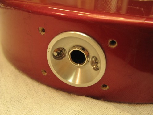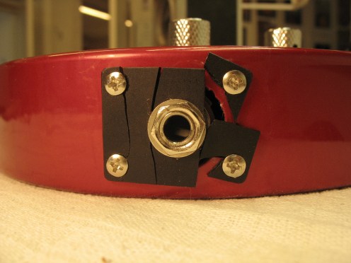 Tämän Squier Telecasterin jakkilevy oli aivan palasina. Soitin on oppilaskäytössä joten siihen haluttiin mahdollisimman kestävä osa.
