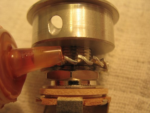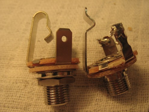 Samalla vaihdettiin myös jakki. Oikealla alkuperäinen kiinalainen jakki, vasemalla uusi Switchcraftin jakki jonkä käyttöikä on monikertainen kaukoidän jakkeihin verrattuna.