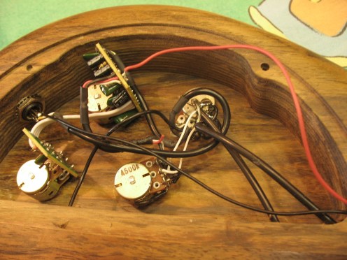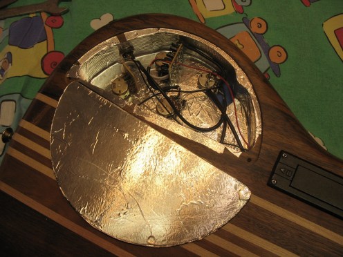 Ensimmäiseksi suojattiin kolo jossa potikat ja elektroniikka ovat. Tämä auttoi jonkin verran, ei kuitenkaan tarpeeksi.