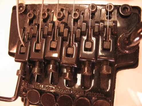Edullisissa sähkökitaroissa olevat Floyd Rose -tyyppiset tallat ovat yleensä ns. lisenssitalloja (licenced…). Ne näyttävät samalta kuin aitokin, mutta ovat usein huonommasta metallista tehtyjä. Tässä LTD:ssä oli ongelmia ala-E-kielen tallapalassa.