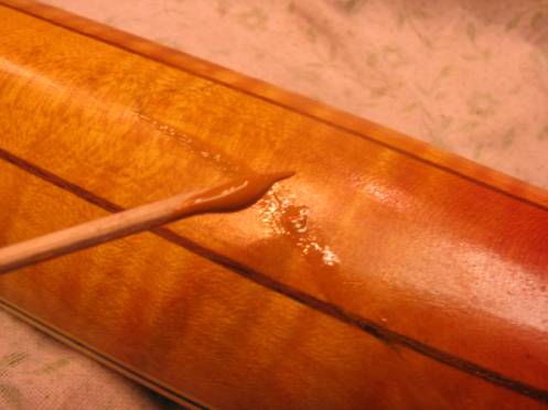 Kaula sävytetään kirsikanpunaisella ja lakataan nitroselluloosalakalla.