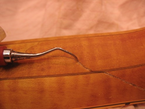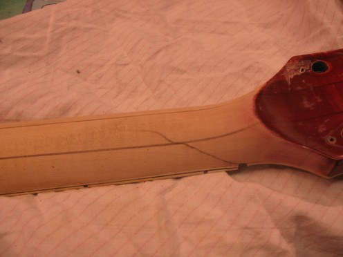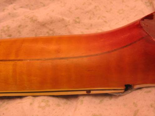 Aluksi sauma liimattiin uudestaan kunnolla, sen jälkeen kaula hiottiin puhtaaksi.