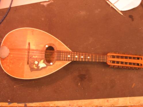 Toinen vanha mandoliini sotia edeltävältä ajalta. Tämä soitin on sikäli poikkeuksellinen, että siinä on 16 kieltä! Näistä on ilmeisesti käytetty myös nimitystä mandriola.