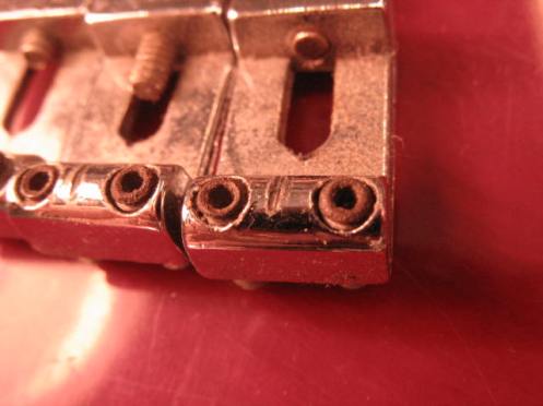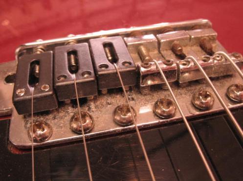 Replacing old worn saddles on a Stratocaster with Graph Tech teflon saddles helps to keep the guitar in tune.