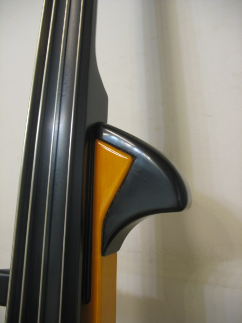On this Stagg electric upright bass the fingerboard had to be levelled. The hand- and bodyrests that came with the bass felt akward. New rests were made from wood and lacquered black. The upper rest was glued to the bass and the lower was attached with bolts so it can be removed during transportation.