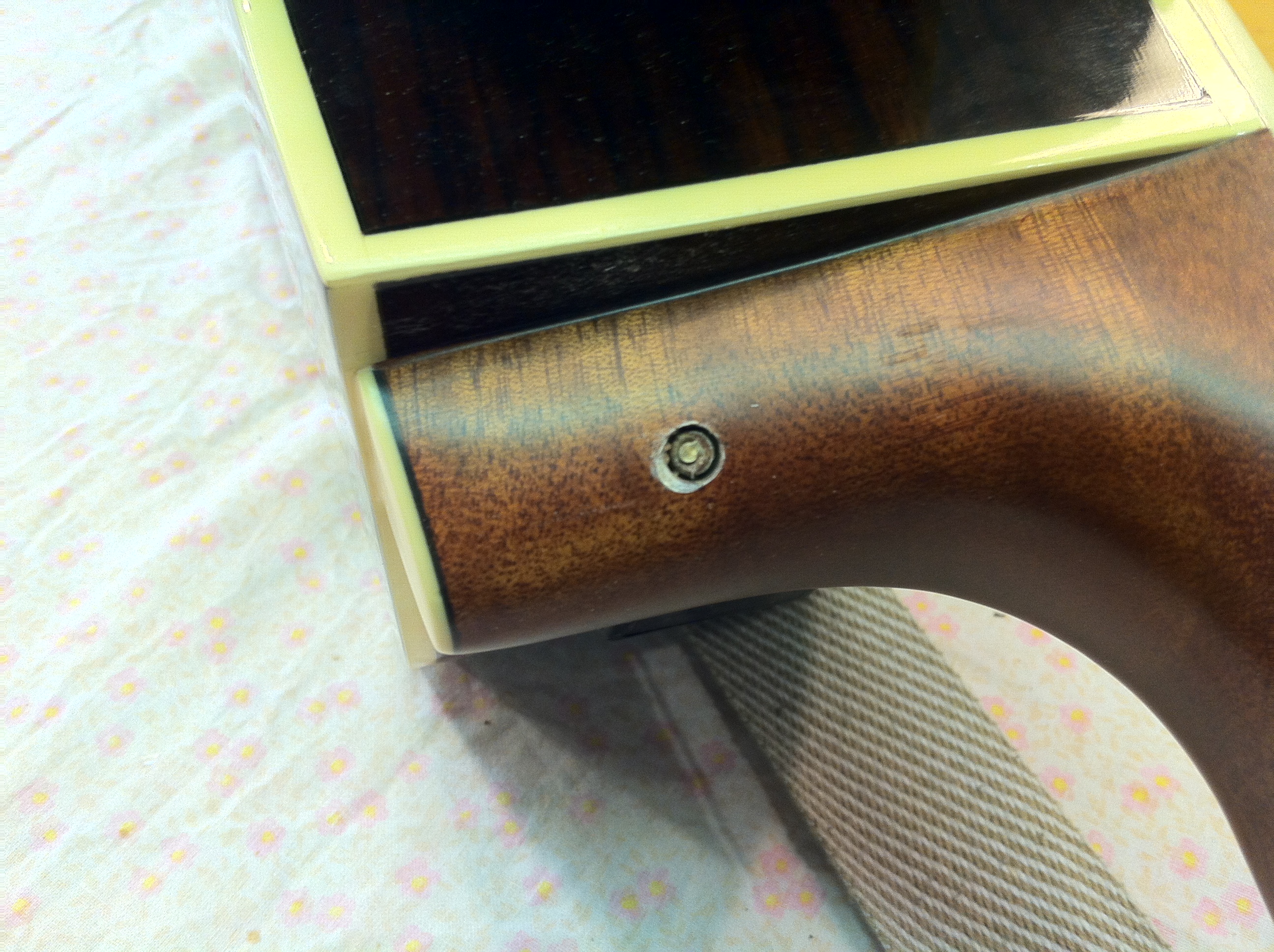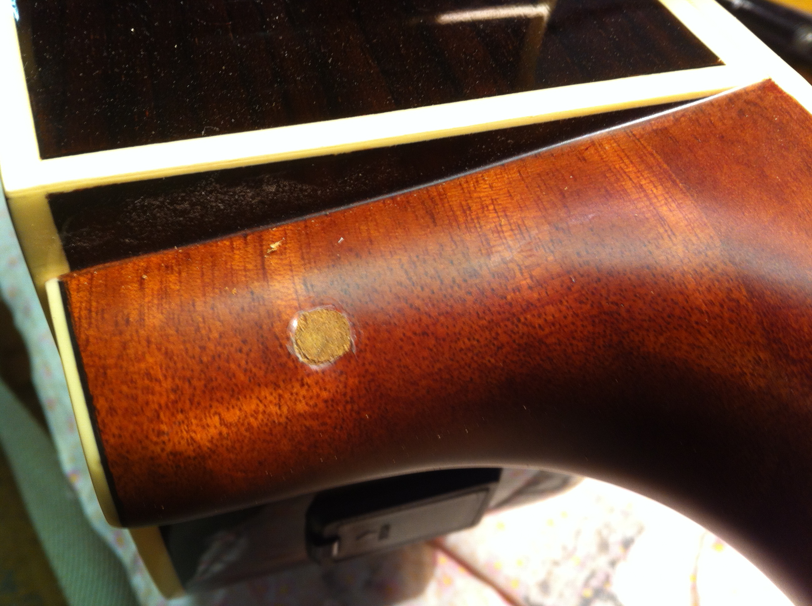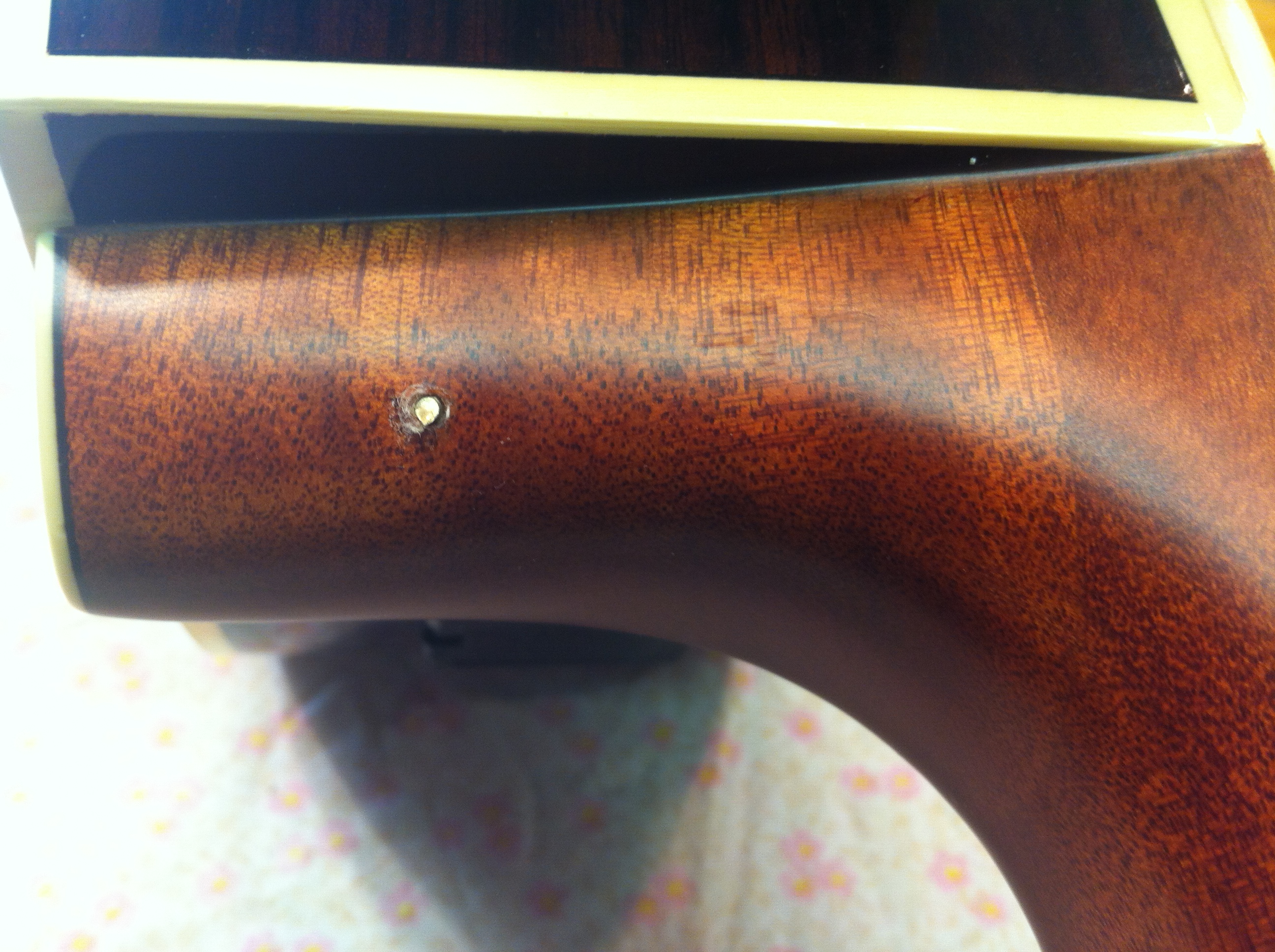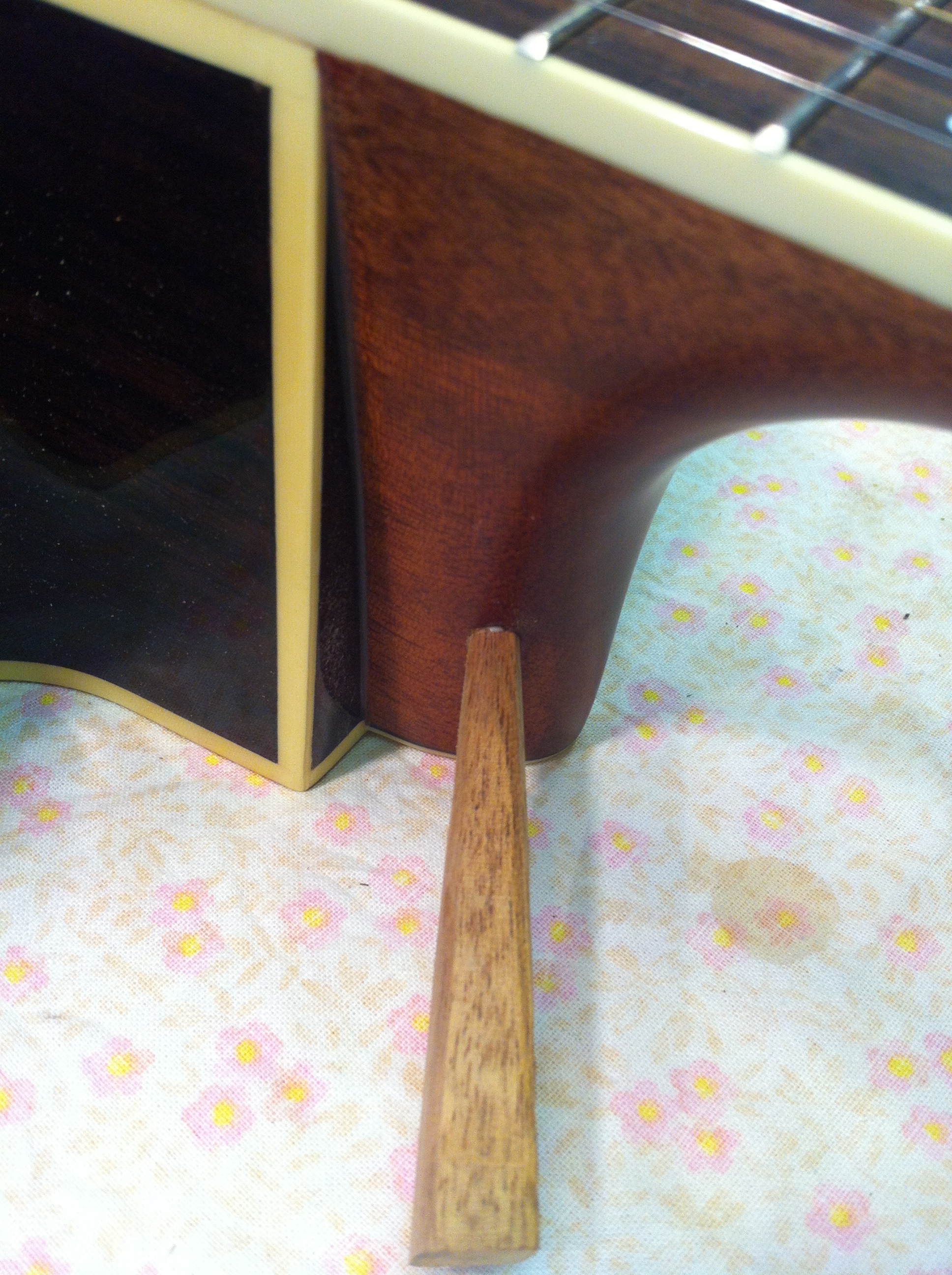 Reikään liimataan puutappi. Tässä käytetään mahonkia koska kaulakin on mahonkia.