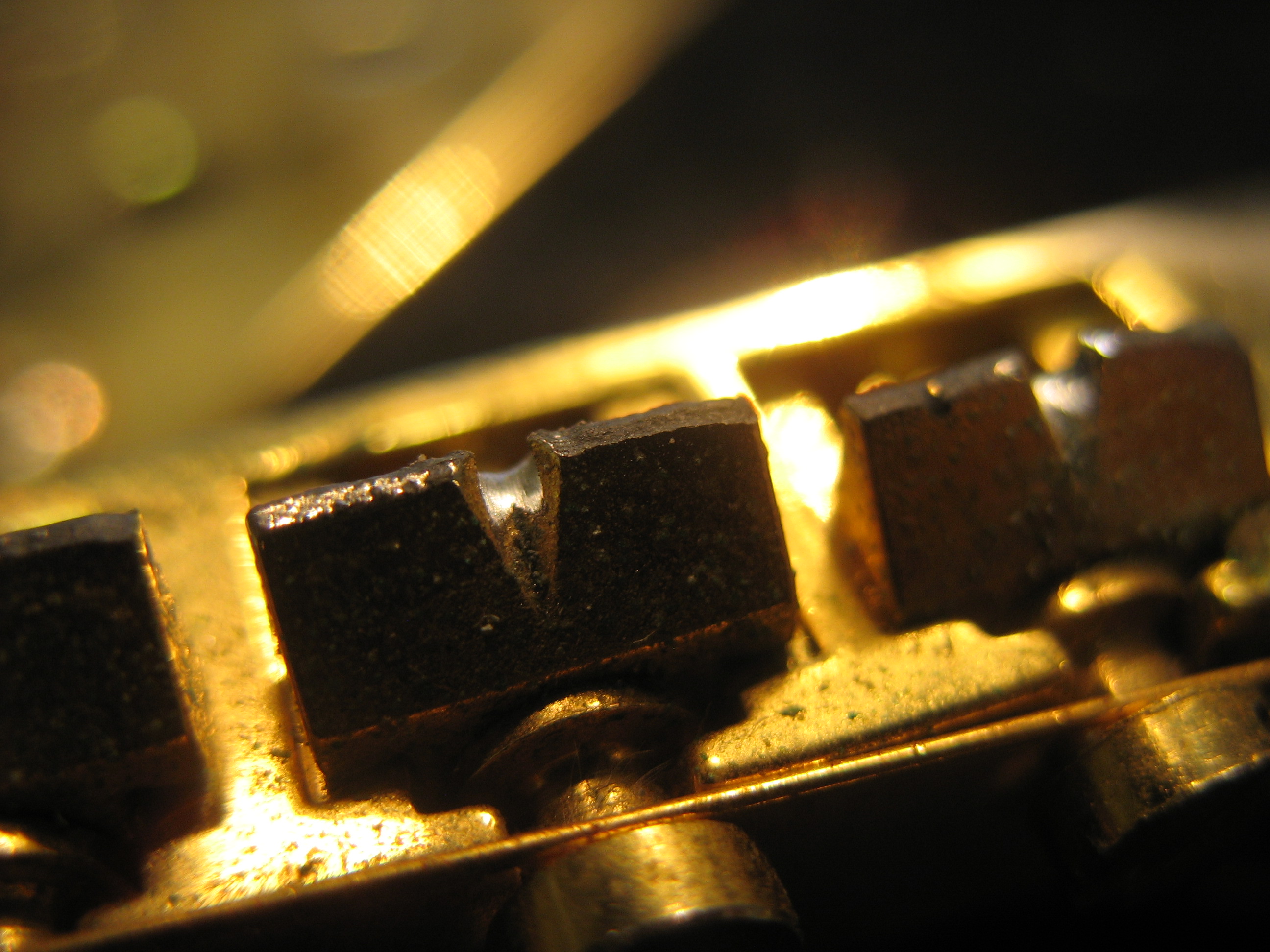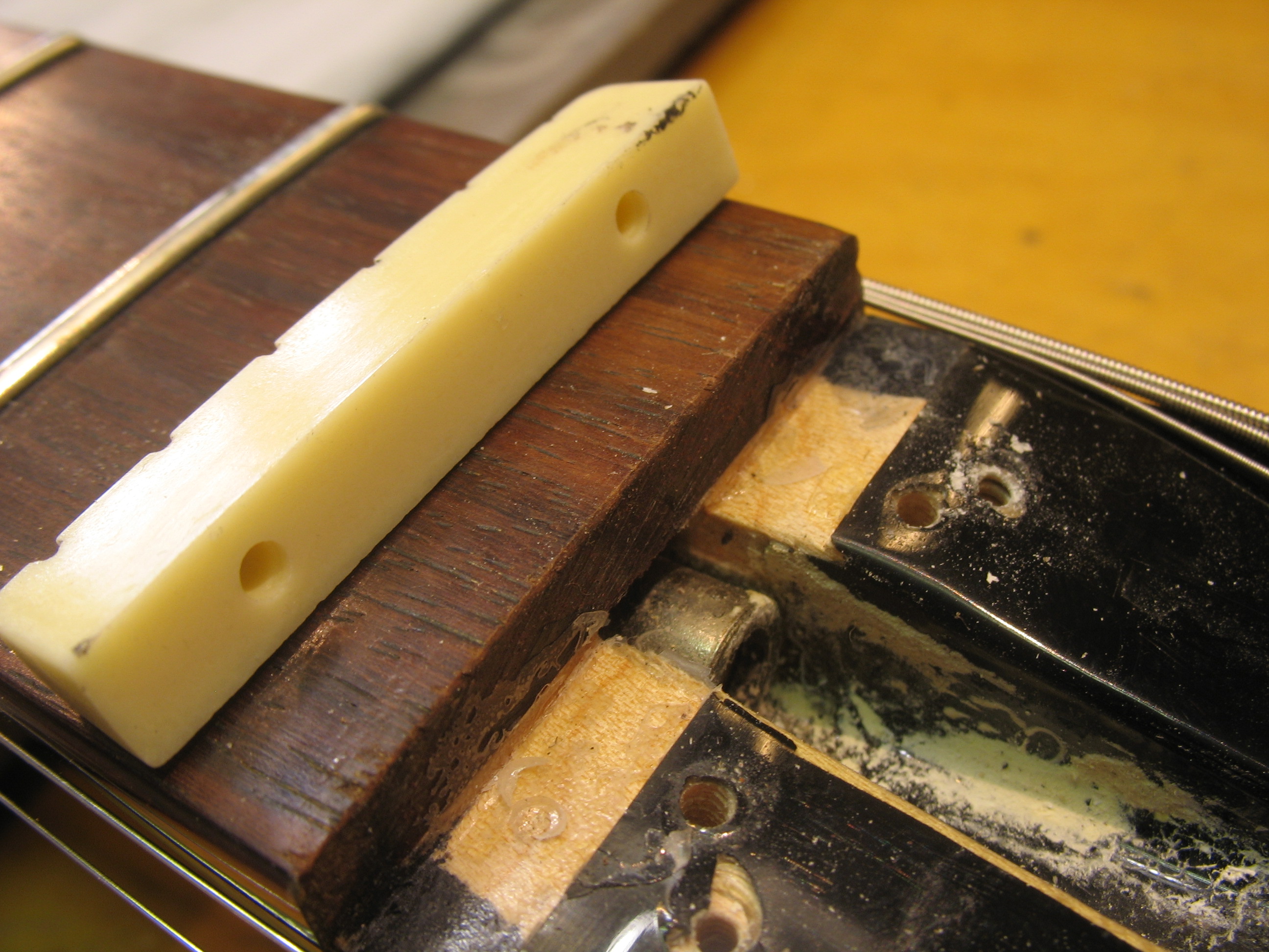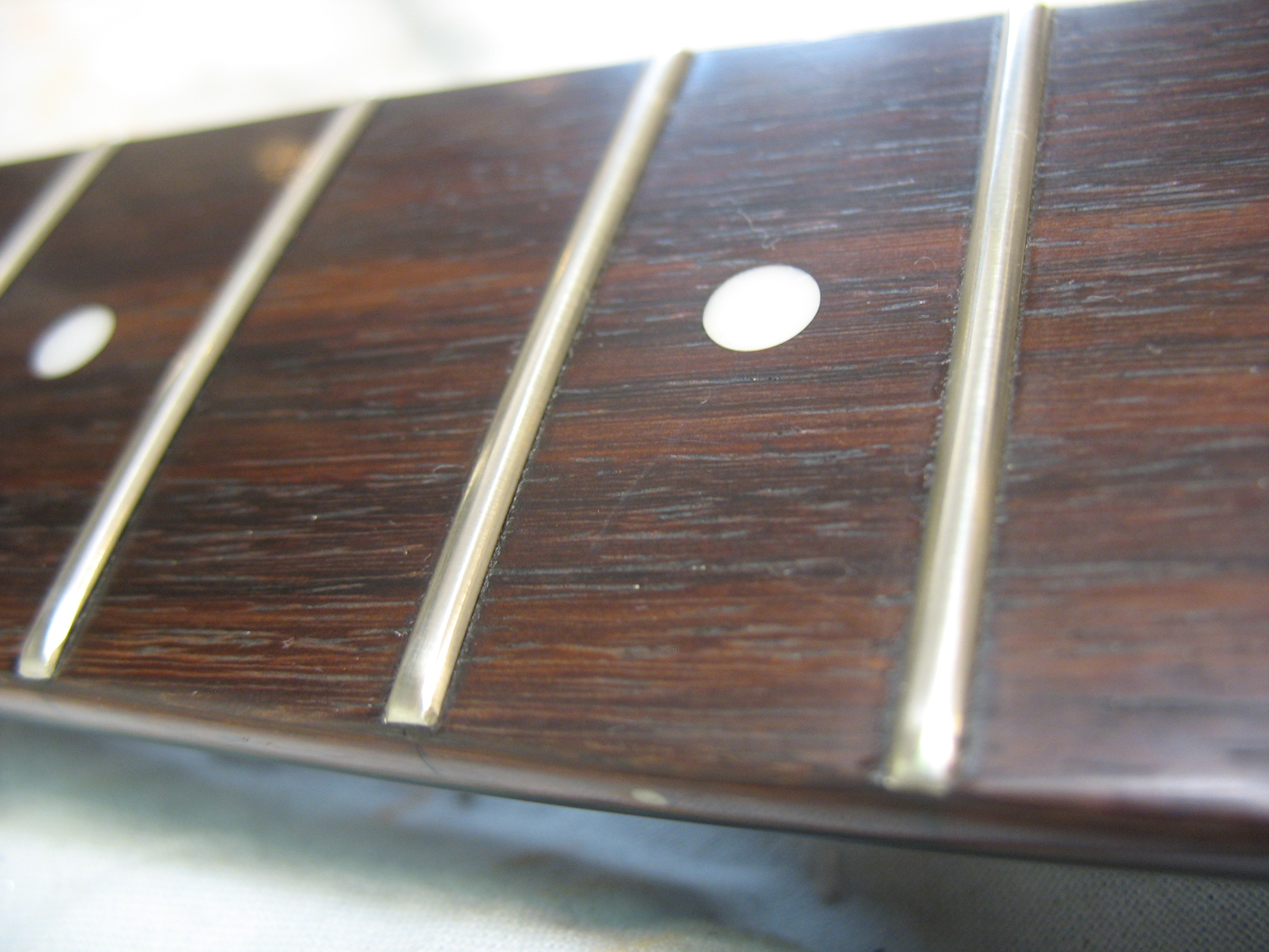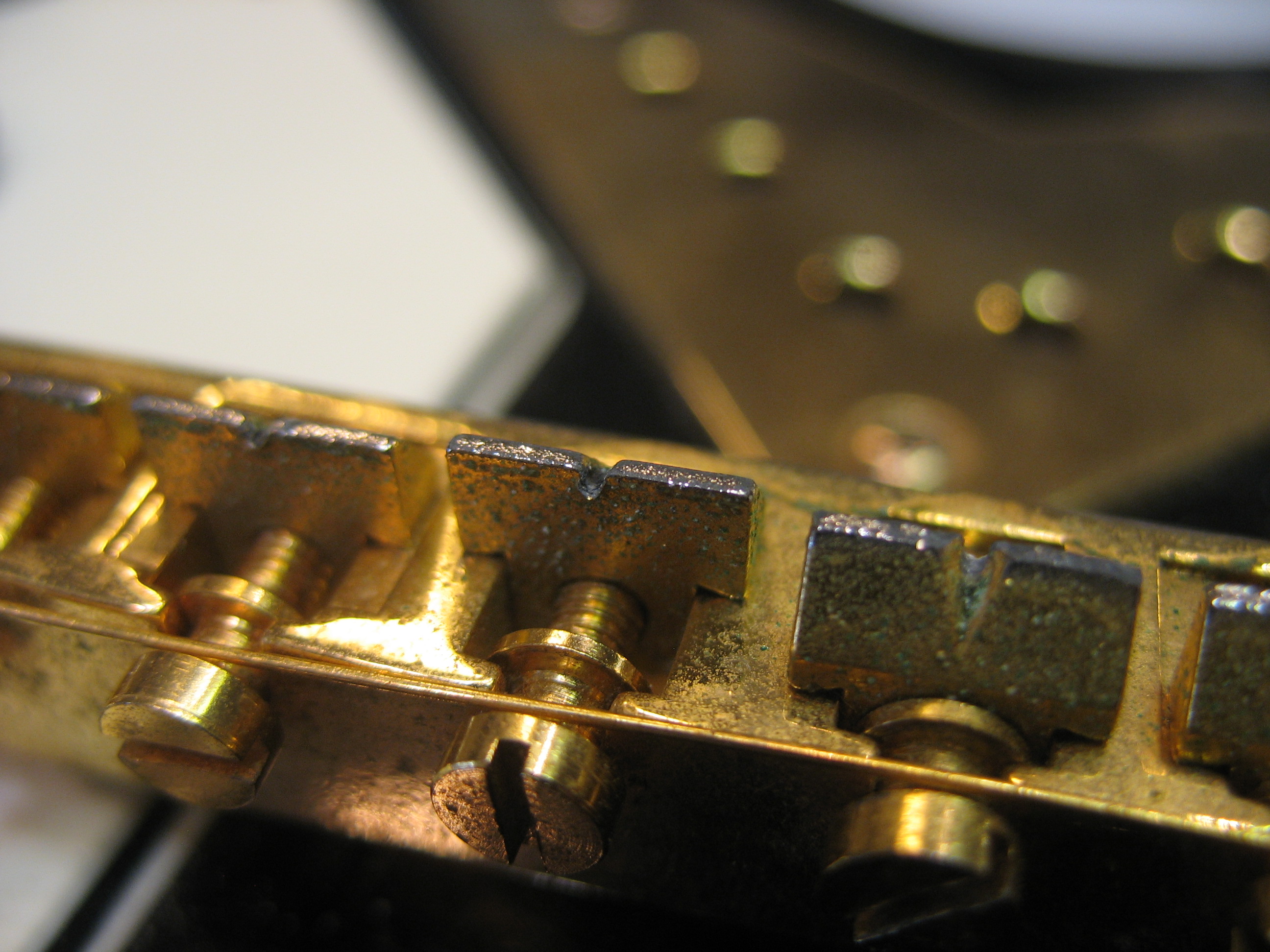 Aluksi tarkistetaan kaulan suoruus ja kaularaudan toimivuus. Tässä tapauksessa kaulan sai säädettyä suoraksi. Nauhat olivat muuten hyvässä kunnossa, muutamia koholla olevia nauhoja silti löytyi.