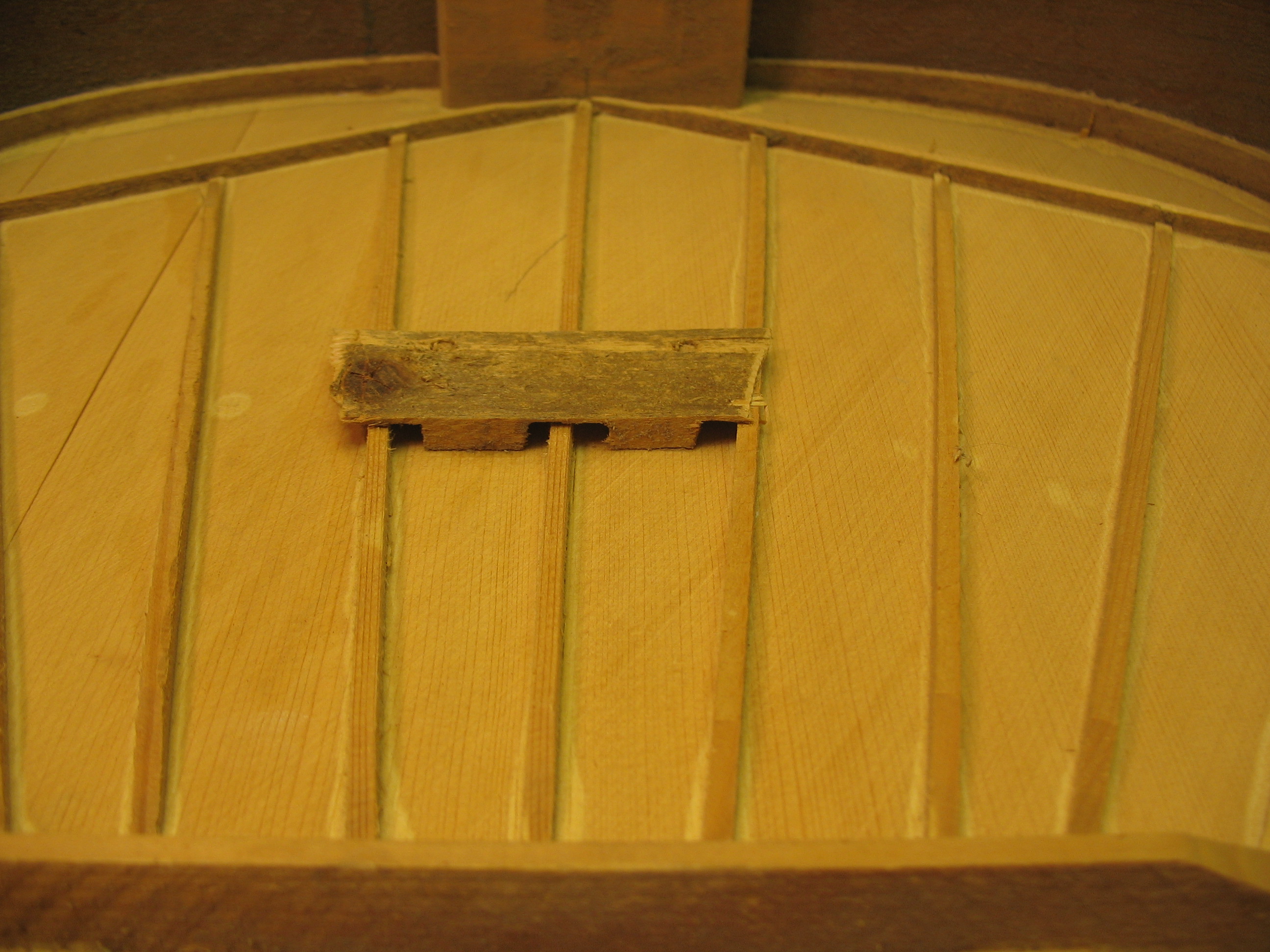 Liimasaumoja oli irti niin paljon että pohja piti irrottaa. Tässä kuvassa näkyy kannen  viuhkarimoitus. Useimmissa tuon aikakauden suomalaisissa kitaroissa käytettiin poikittaista tikapuurimoitusta. Keskellä näkyvä rakennelma on tallan liimauksessa käytettyjen kohdistustappien tukemista varten.