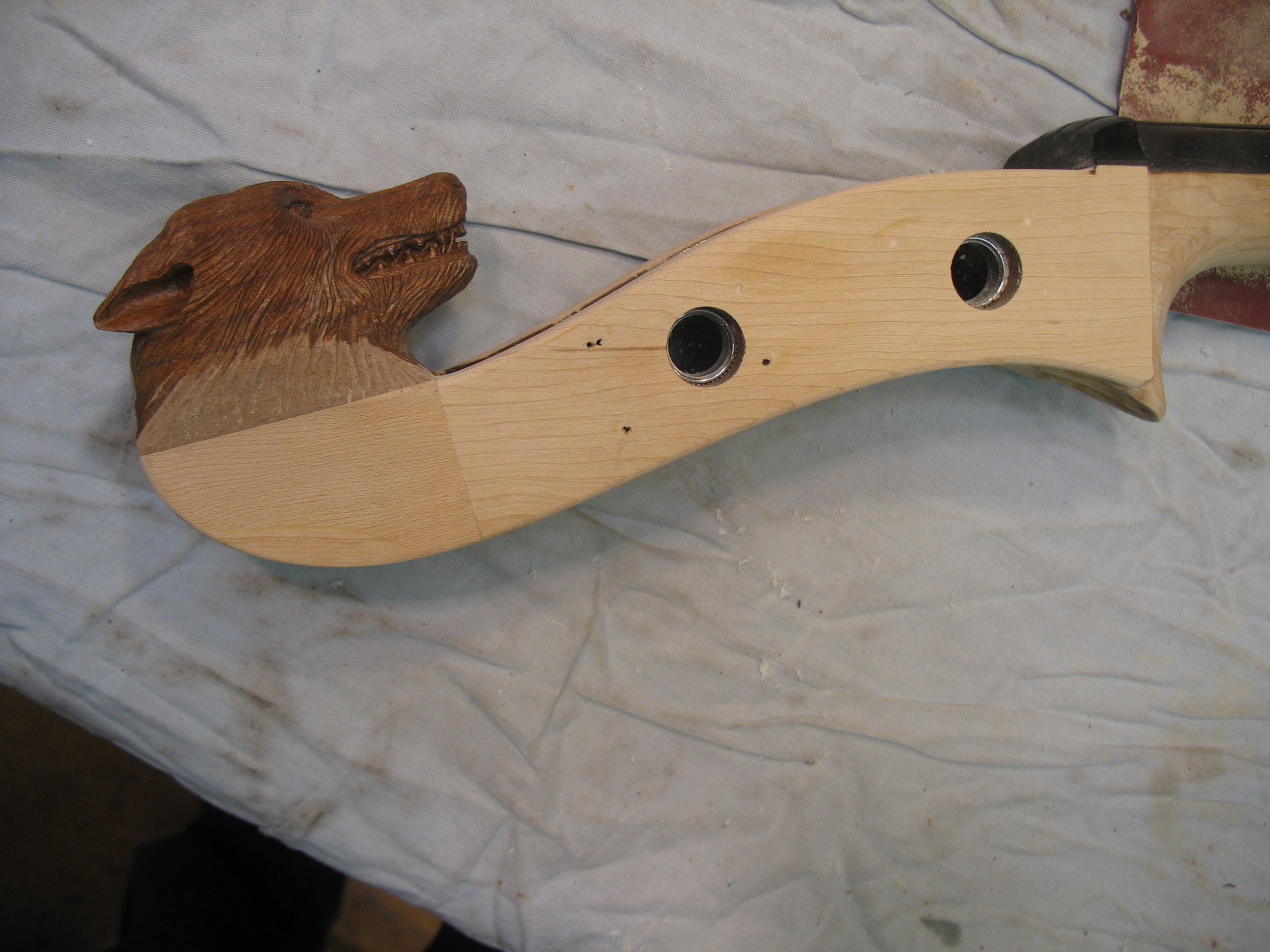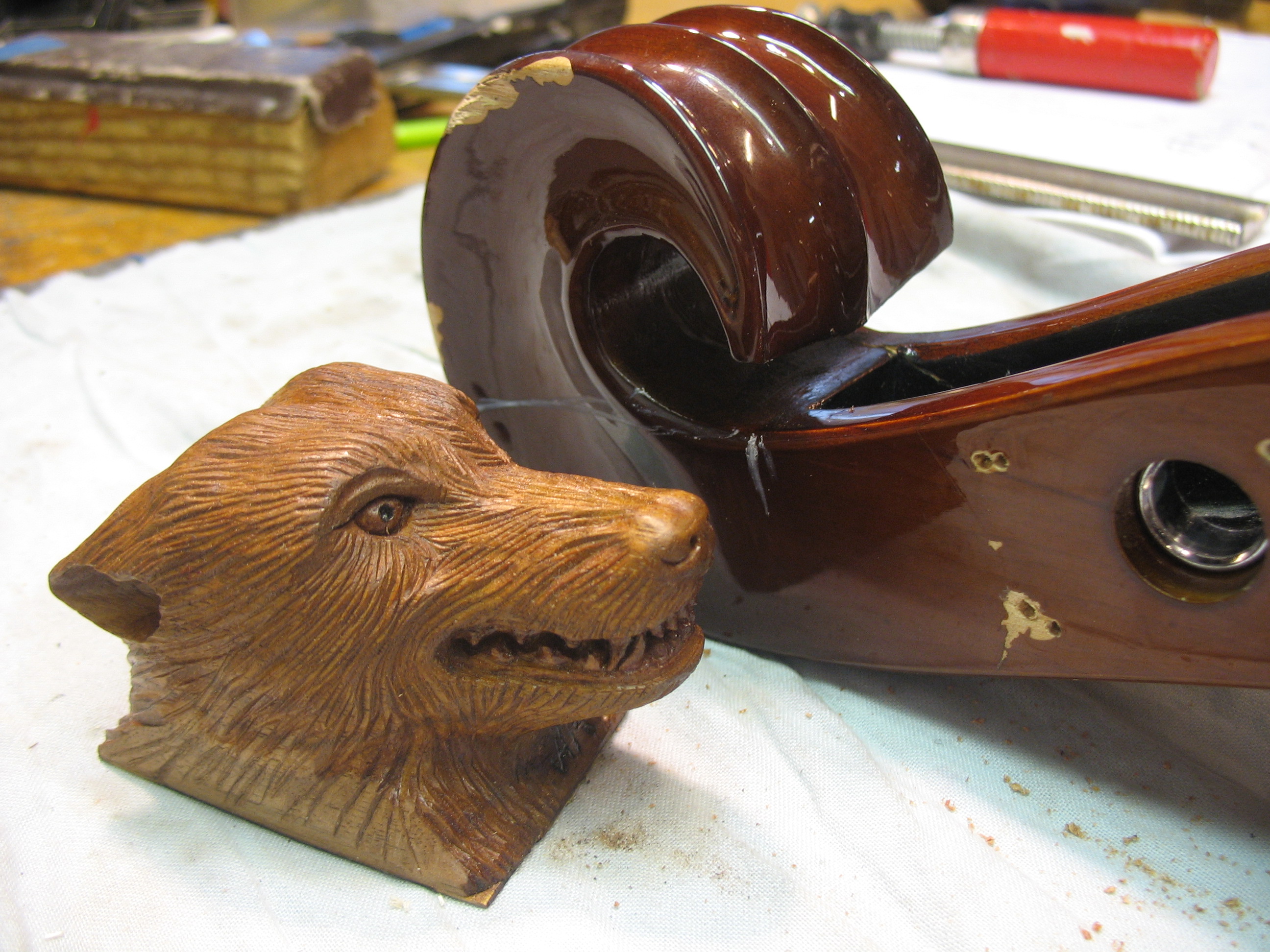 Tämän kontrabasson kierukka oli kolhiintunut. Sen sijaan että olisi lähdetty paikkailemaan sitä, päätettiin poistaa vanha kierukka ja asentaa tilalle puinen käsintehty sudenpää.