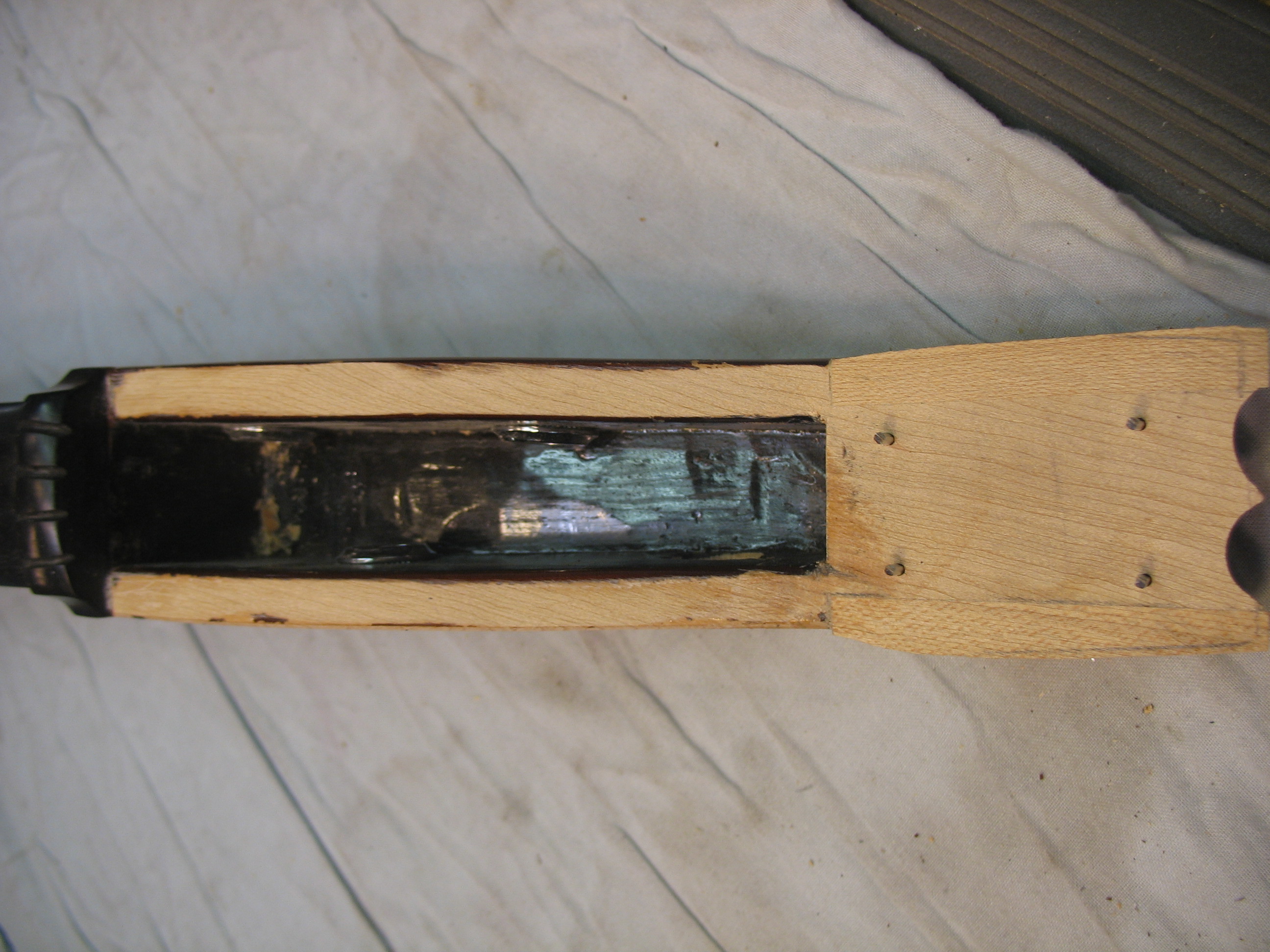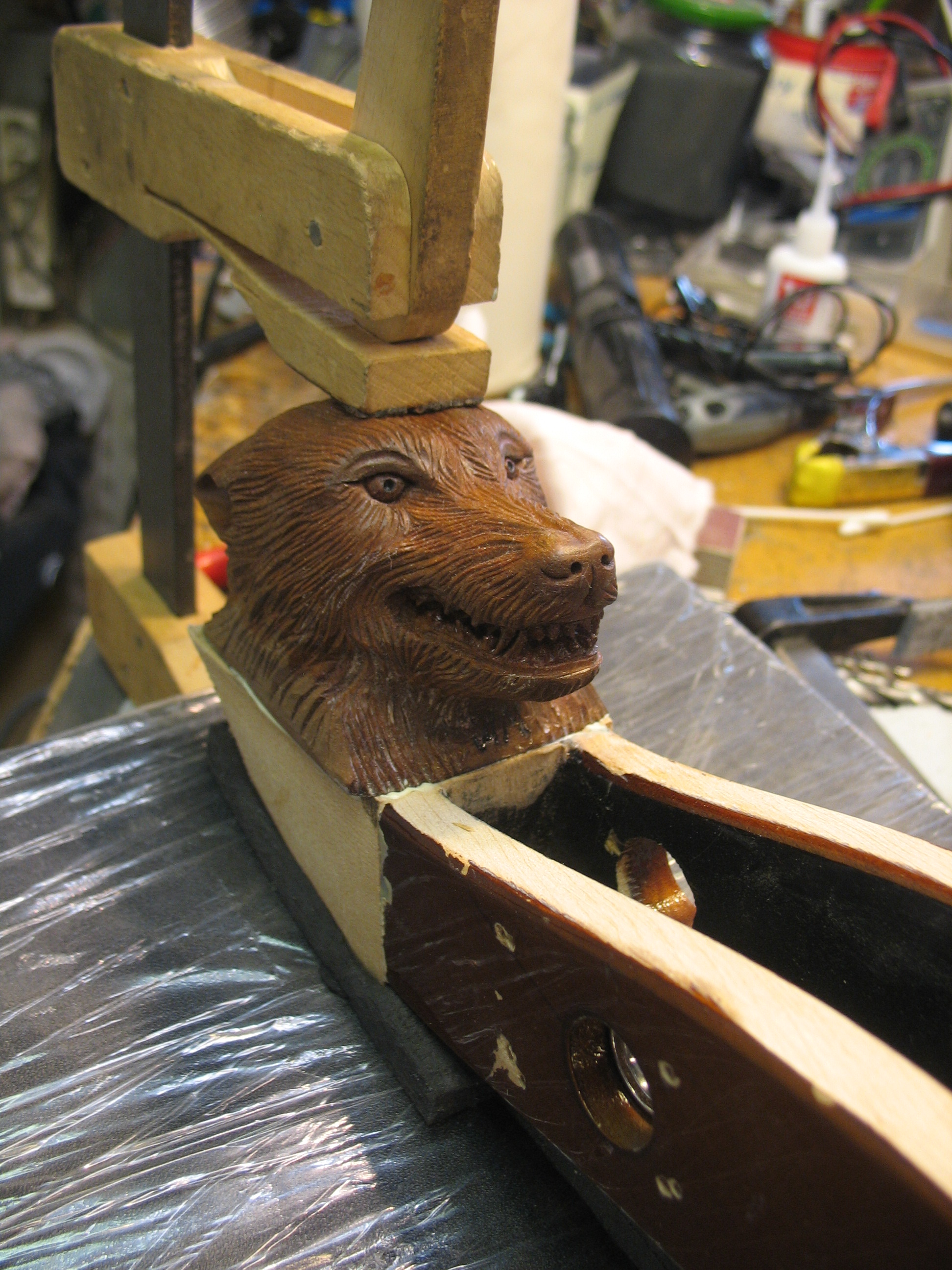 Kierukka sahattiin pois ja sivuille liimattiin lisää puuta koska sudenpää oli leveämpi kuin vanha kierukka. Kuvassa näkyy myös 4 puista kohdistustappia, jotka pitävät pään paikallaan liimauksen ajan.