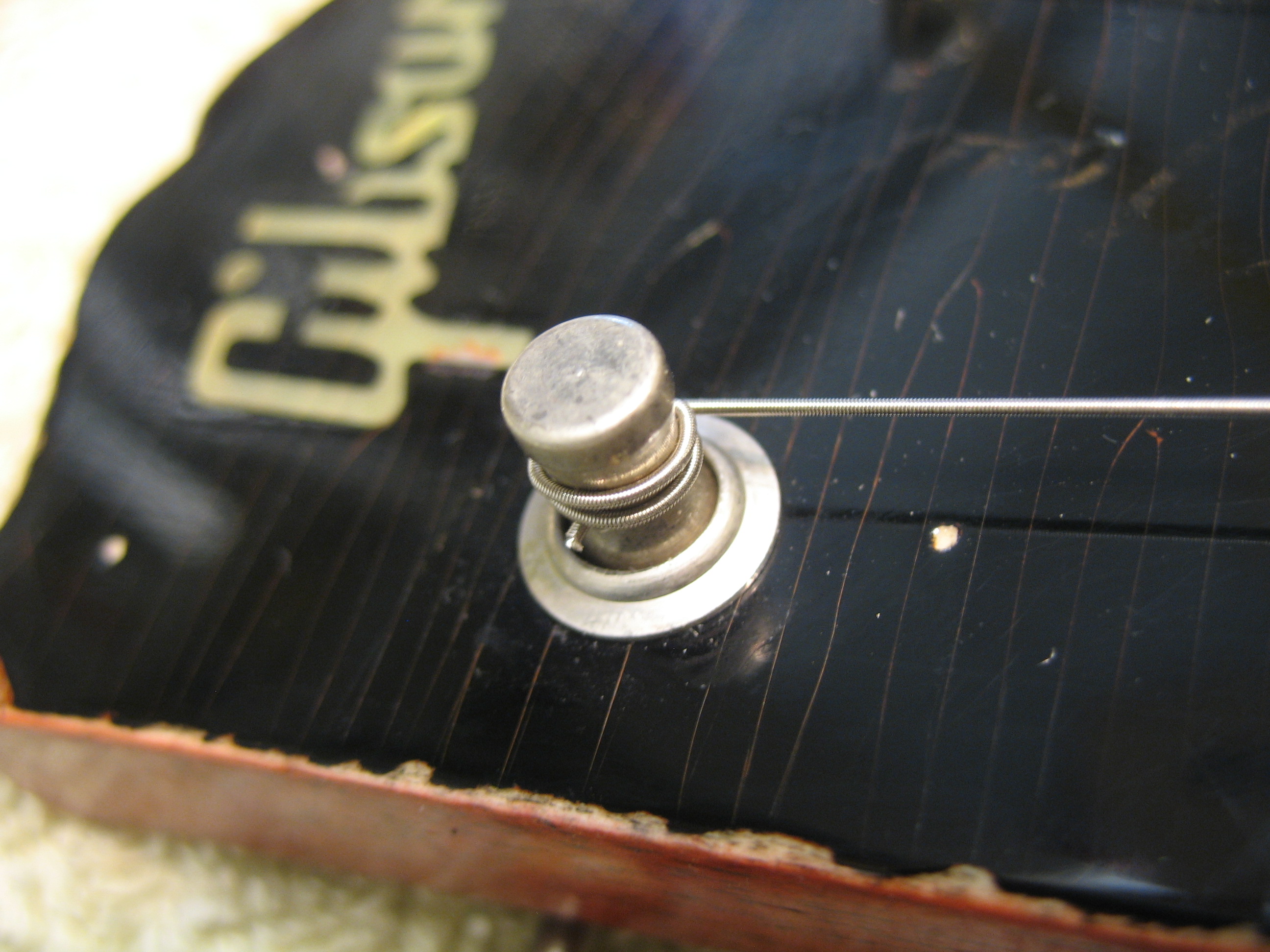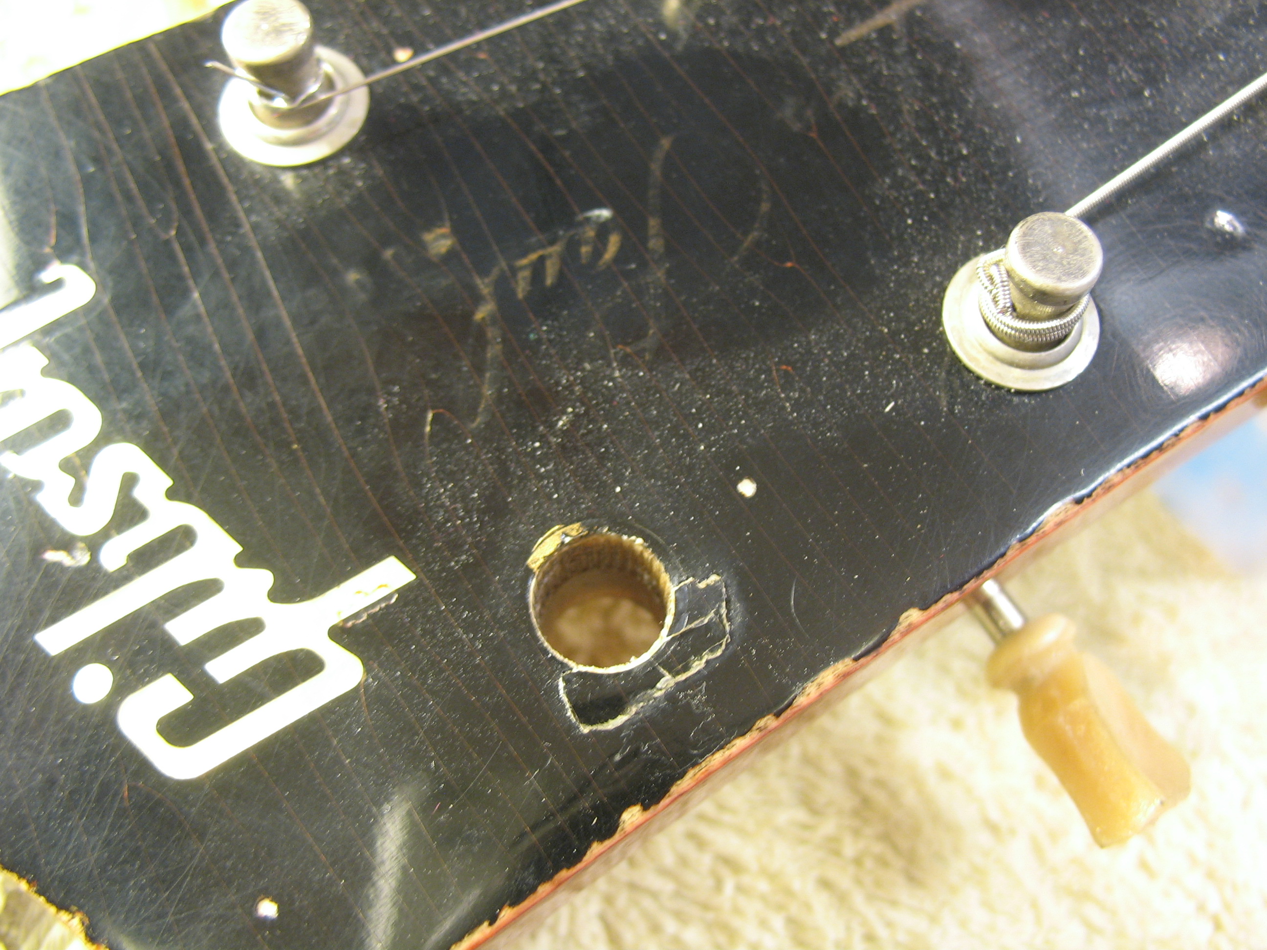 Tämän, jo ikääntyneen, Gibson Les Paulin lavasta oli lojennut pala lakkaa lohjennut virityskoneiston vaihdon yhteydessä.