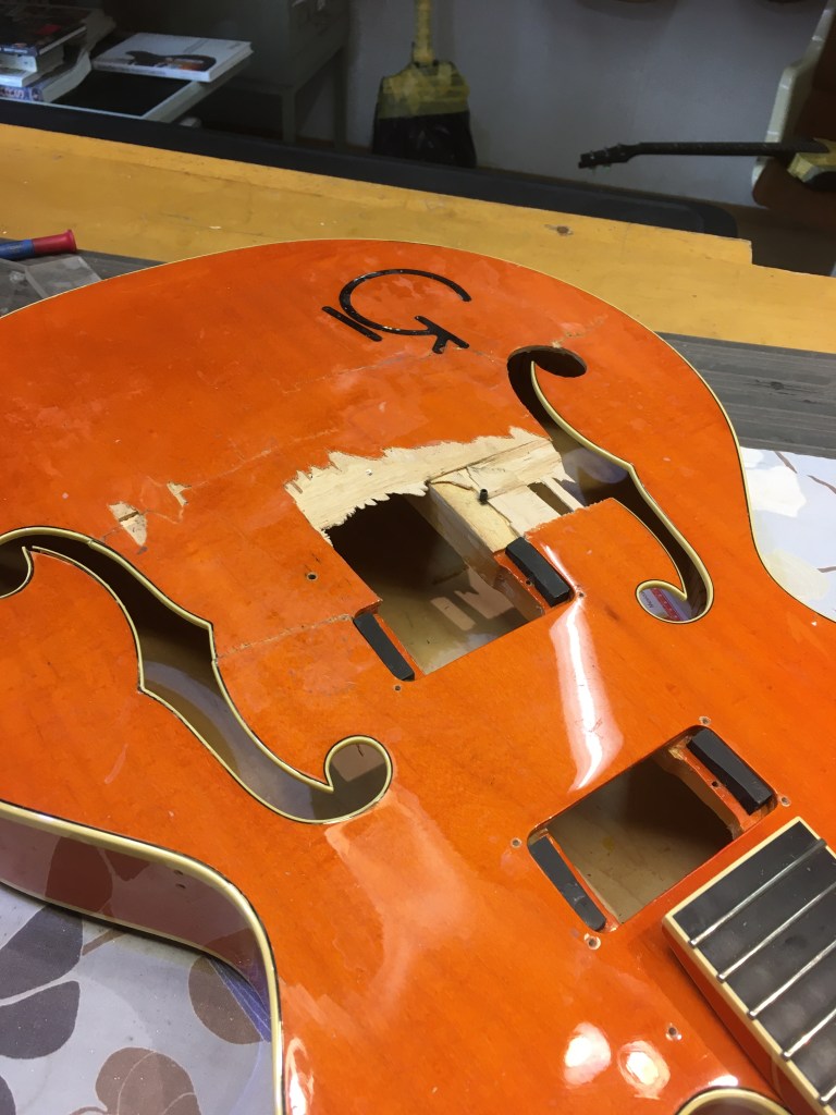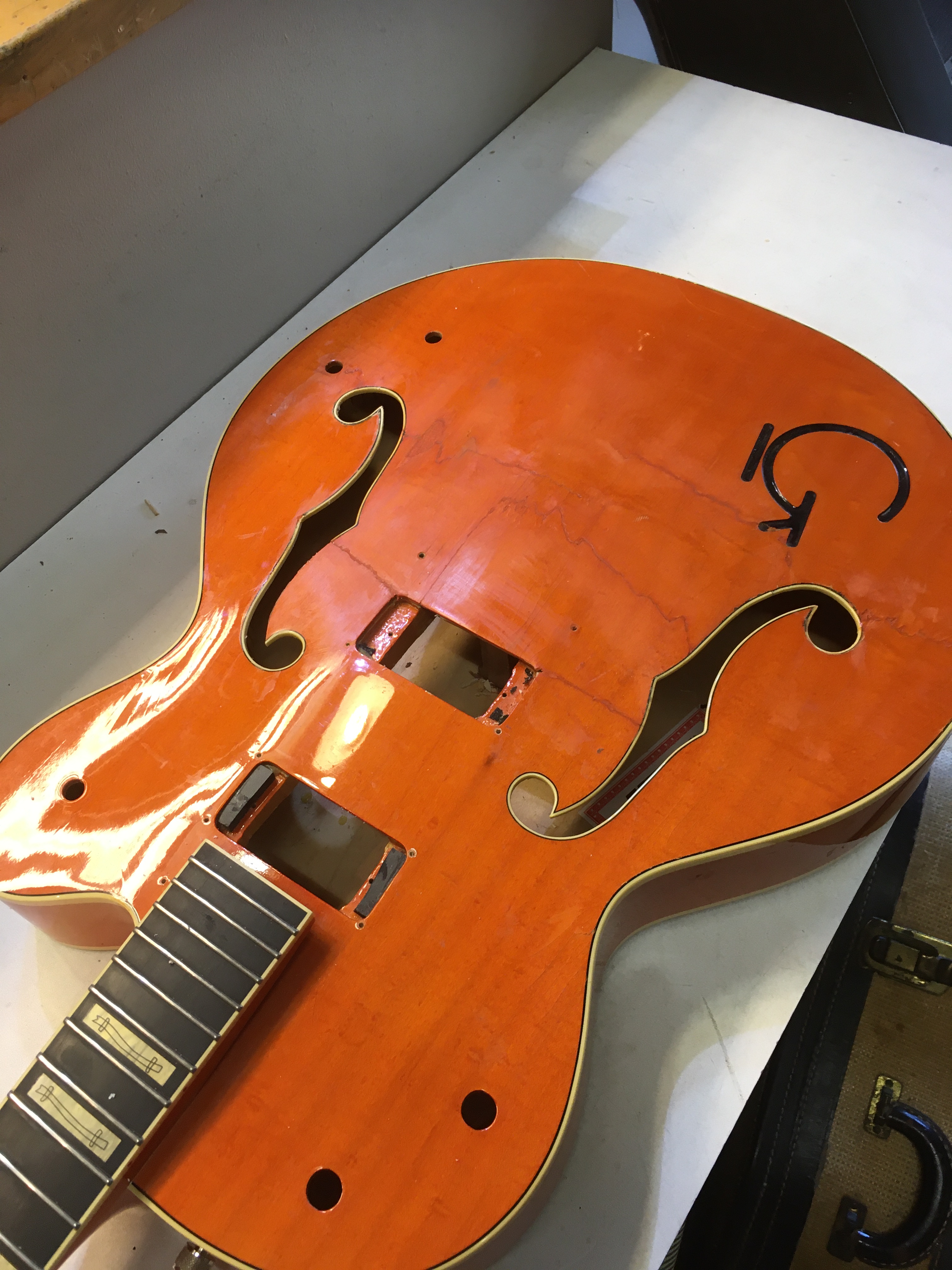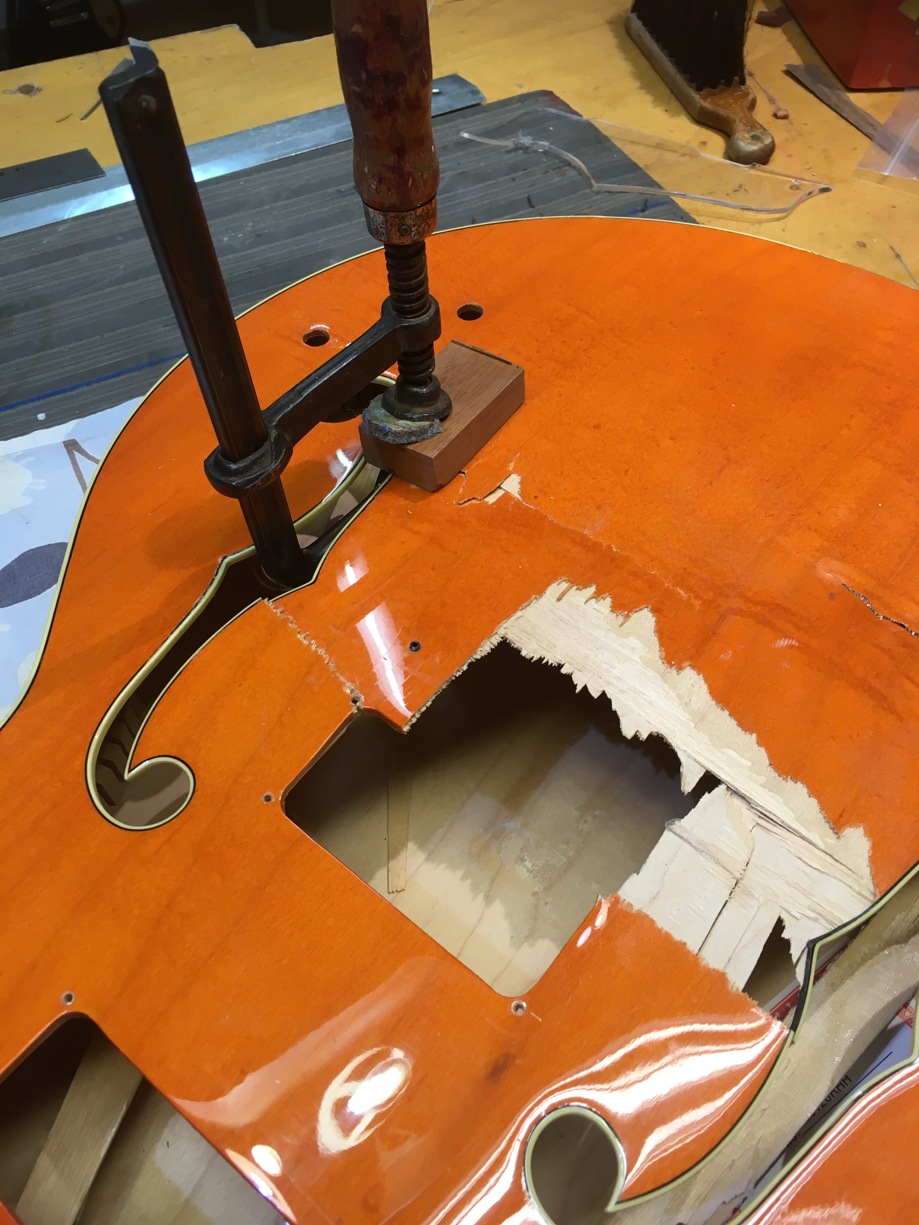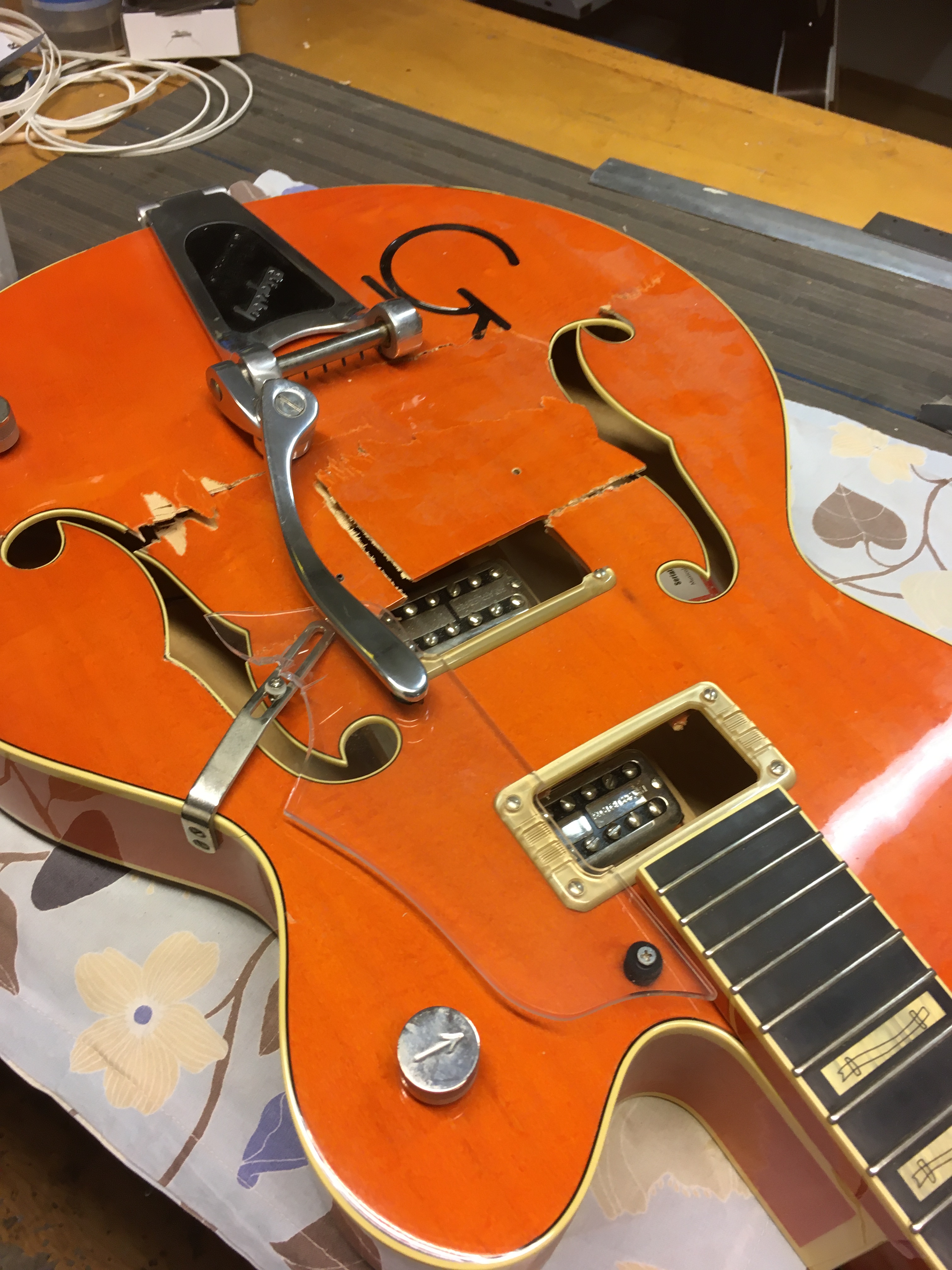 Tämä Gretschin Reverend Horton Heat -malli oli kokenut kovia. Kansi oli täynnä murtumia, isompia ja pienempiä palasia oli irtoillut. Onneksi mikrofonit olivat kuitenkin säilyneet ehjinä.Myös molemmat kannen tukirimat olivat irti. Vaneri -tai laminaattikannen korjauksen tekee hankalaksi se, että viilut ovat irtoilleet toisistaan pitkältä matkalta myös kannen sisäpuolelta ja ne täytyy kaikki saada liimattua takaisin.Tukirimat on liimattu paikoilleen ja kansi alkaa taas olla muodossaan.Puuttuvien palasien kohdalle tehtiin paikat vaahteraviilusta.Kaikki palaset on liimattu paikoilleen ja kansi on sileä. Liimasaumat näkyvät vielä.Kansi lakataan puolipeittävällä oranssilla lakalla.Kun lakka on kovettunut muutaman viikon, se kiillotetaan ja soitin kasataan. Rikkoutuneen mikrofoninkehyksen tilalle asennetaan uusi.Sittei muuta ku soittamaan!