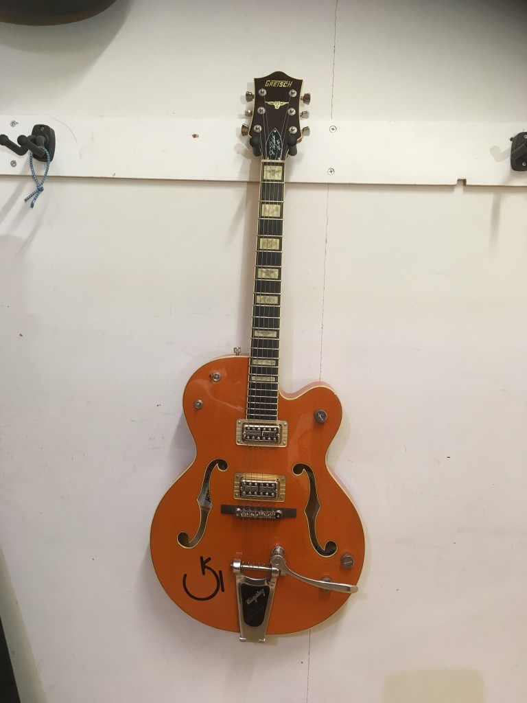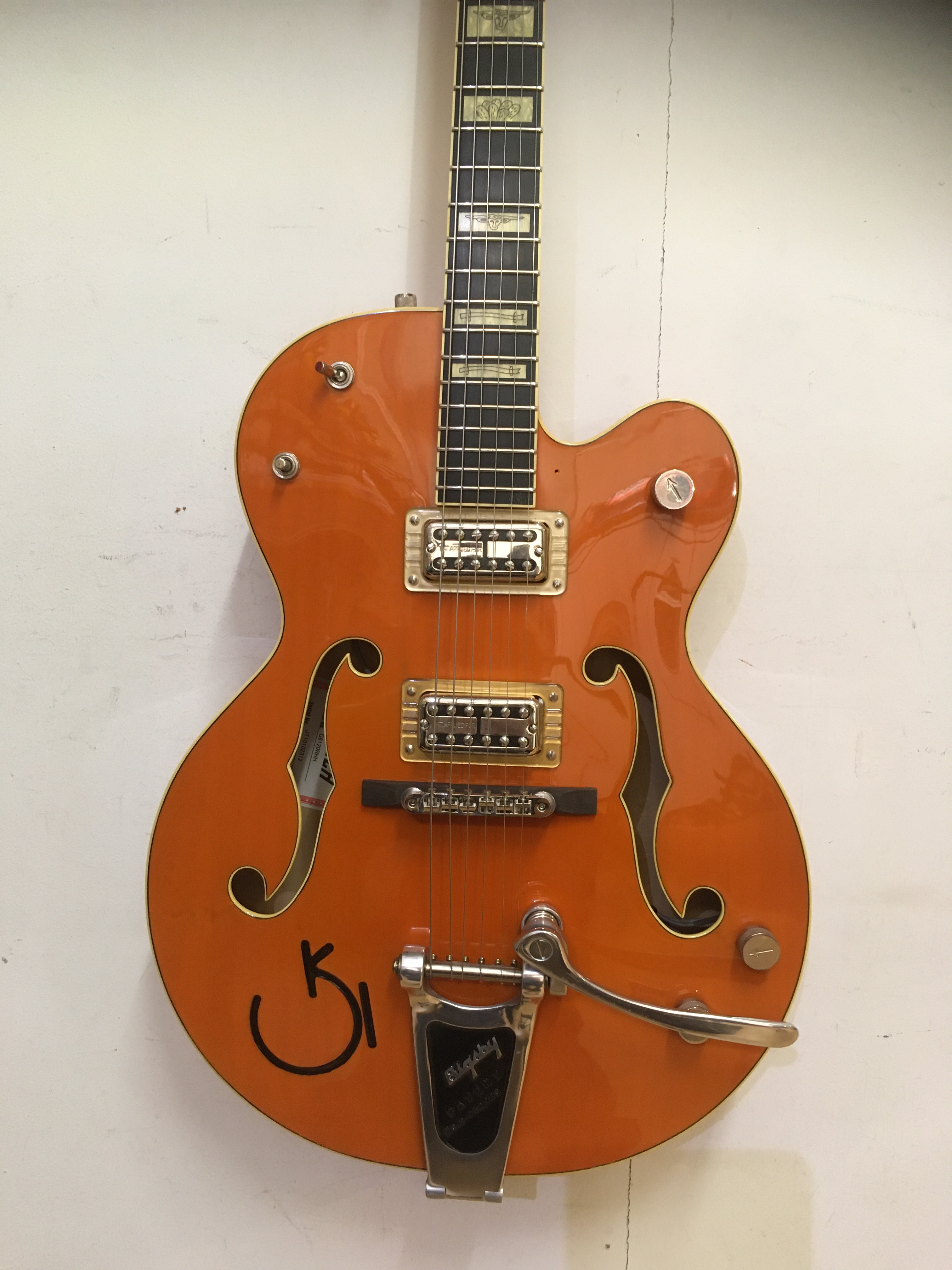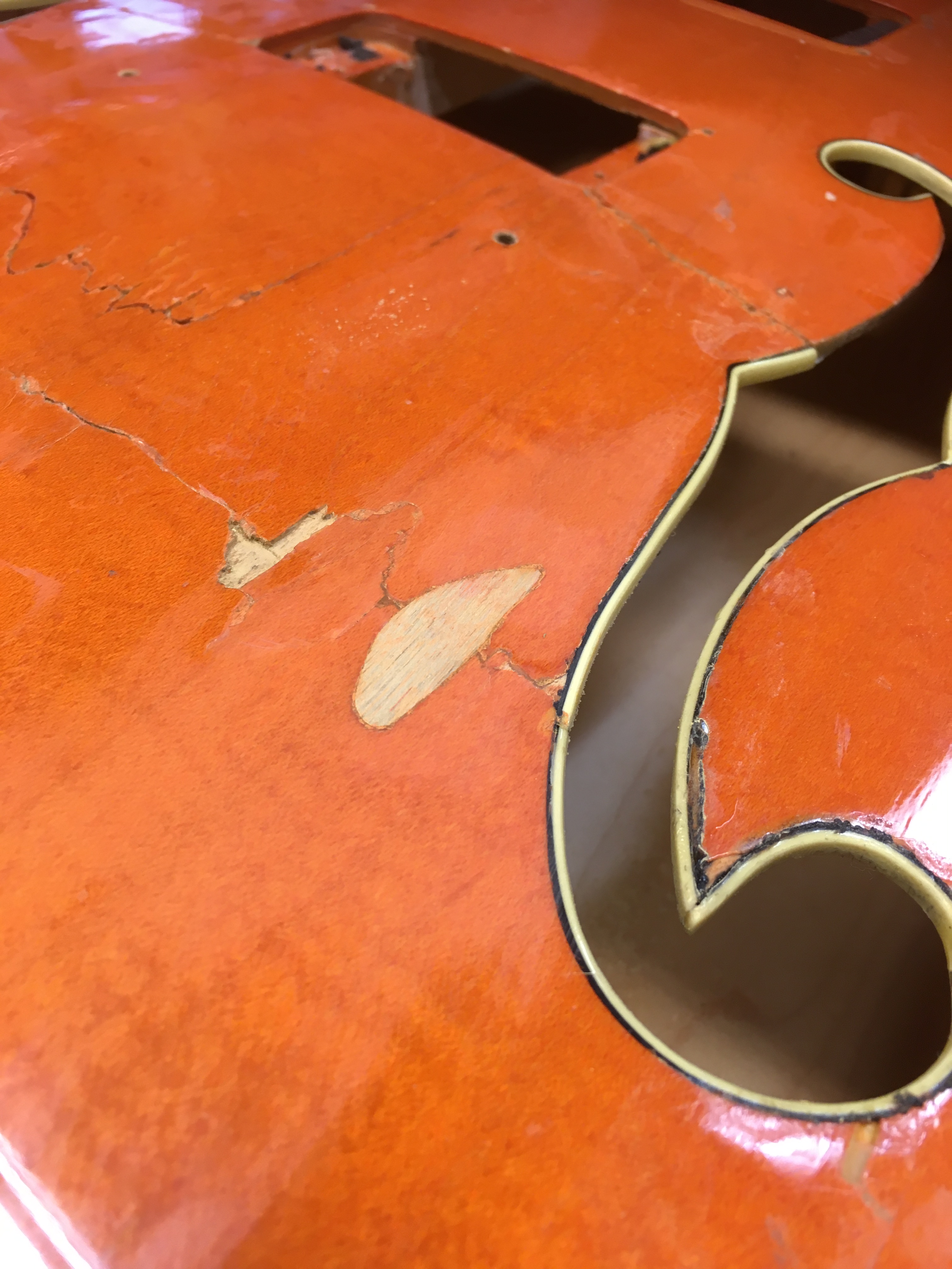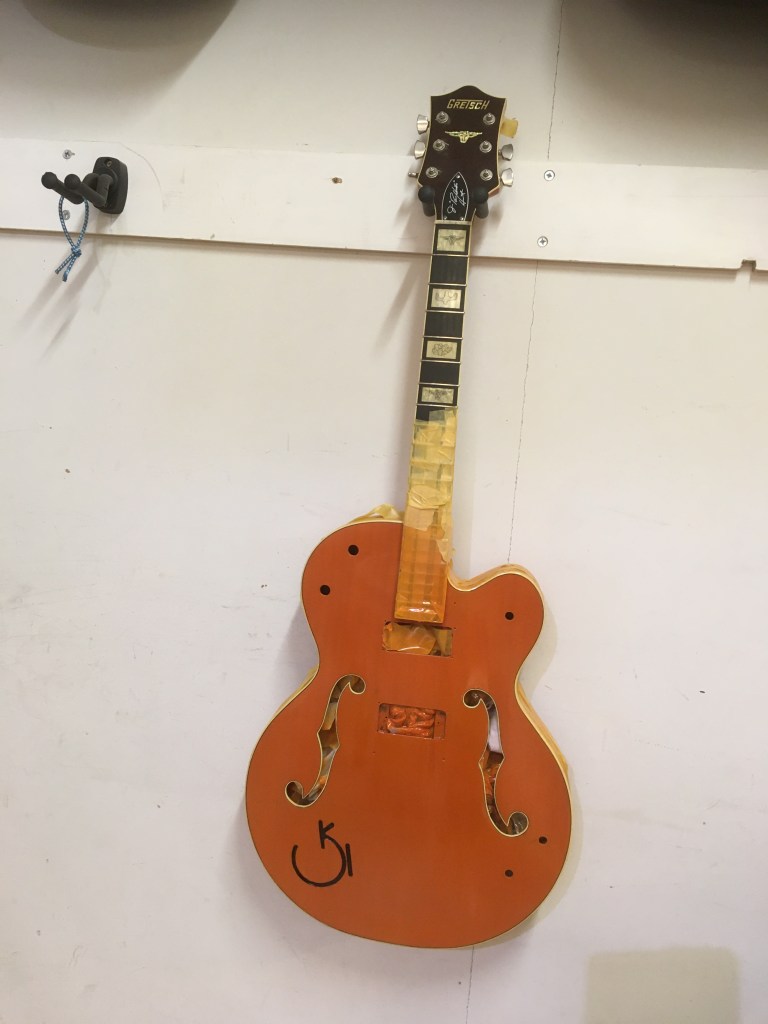 Tämä Gretschin Reverend Horton Heat -malli oli kokenut kovia. Kansi oli täynnä murtumia, isompia ja pienempiä palasia oli irtoillut. Onneksi mikrofonit olivat kuitenkin säilyneet ehjinä.Myös molemmat kannen tukirimat olivat irti. Vaneri -tai laminaattikannen korjauksen tekee hankalaksi se, että viilut ovat irtoilleet toisistaan pitkältä matkalta myös kannen sisäpuolelta ja ne täytyy kaikki saada liimattua takaisin.Tukirimat on liimattu paikoilleen ja kansi alkaa taas olla muodossaan.Puuttuvien palasien kohdalle tehtiin paikat vaahteraviilusta.Kaikki palaset on liimattu paikoilleen ja kansi on sileä. Liimasaumat näkyvät vielä.Kansi lakataan puolipeittävällä oranssilla lakalla.Kun lakka on kovettunut muutaman viikon, se kiillotetaan ja soitin kasataan. Rikkoutuneen mikrofoninkehyksen tilalle asennetaan uusi.Sittei muuta ku soittamaan!