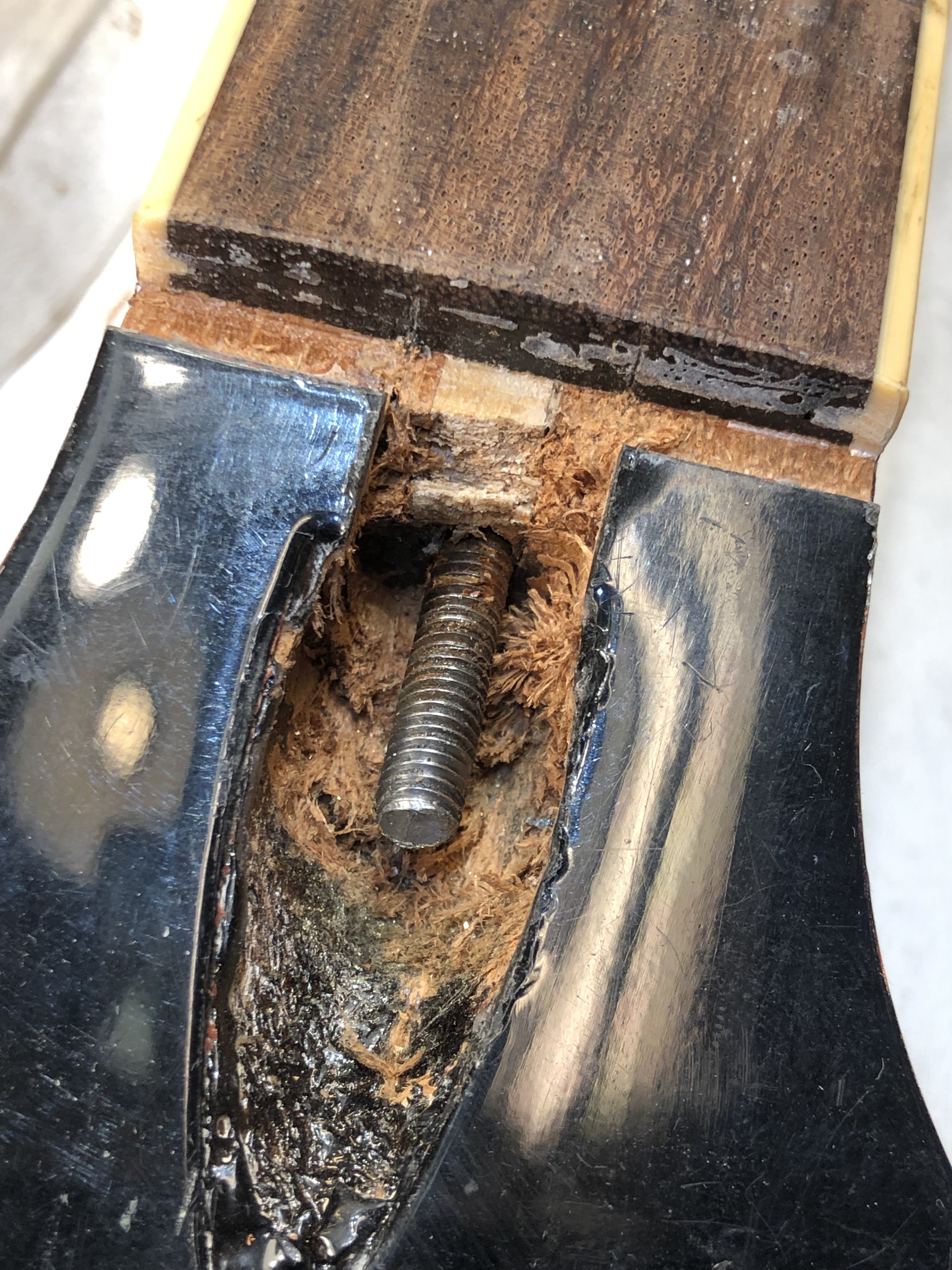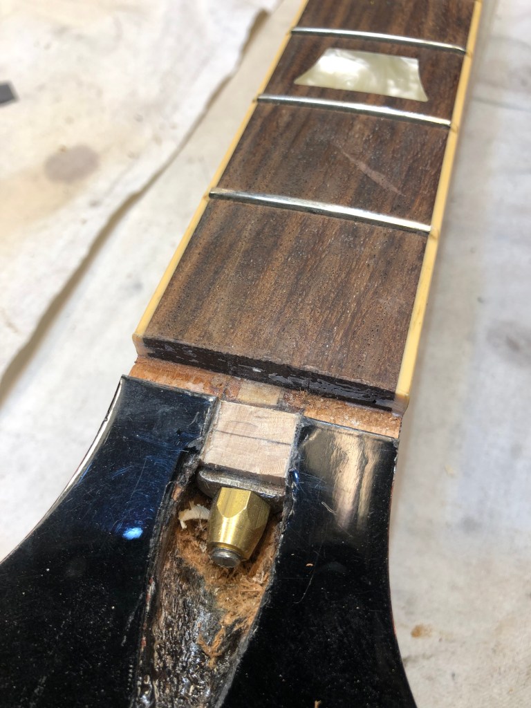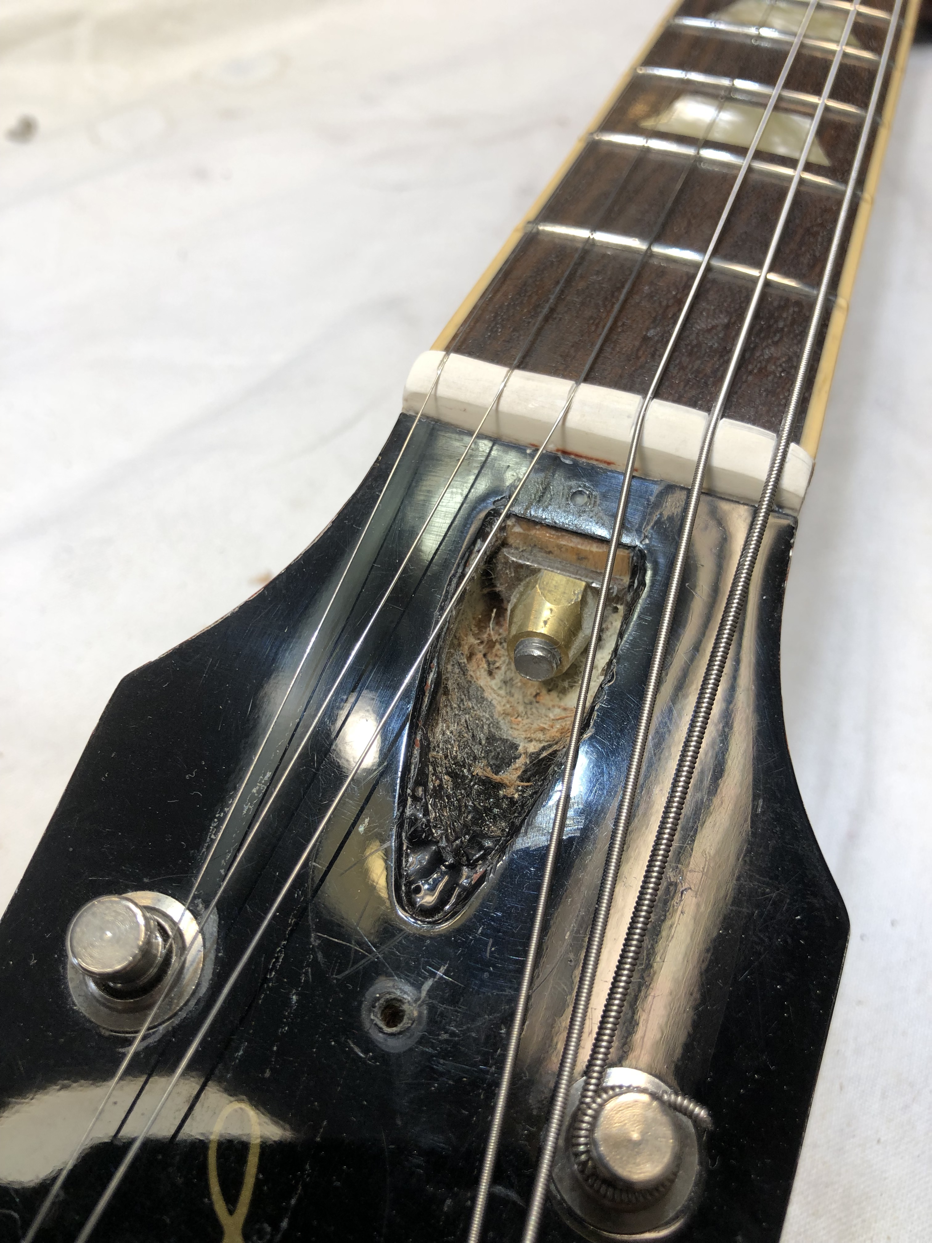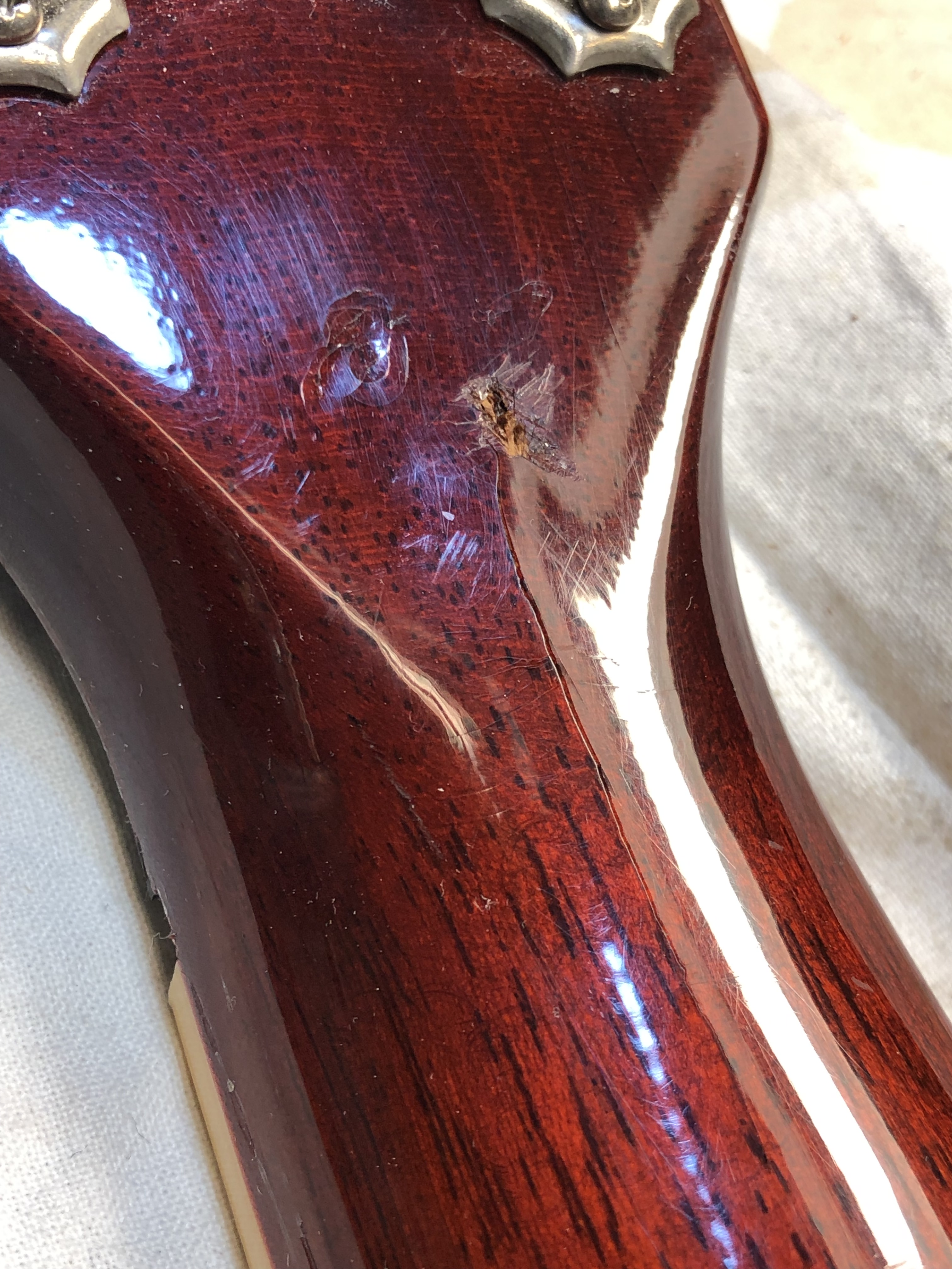 Tämä uudehko Gibson Les Paul oli kärsinyt kaulaongelmista, kaula oli liikaa notkolla eikä rauta meinannut jaksaa suoristaa sitä. Kaularautaa oli yritetty kiristää käytten reilusti liikaa voimaa, sekä jotain sopimatonta työkalua. Raudan pää oli vääntynyt sivulle, ympärillä olevaa puuta oli tuhoutunut ja mutteri myös mennyt pyöreäksi.Kaula oli myös haljennut toiselta puolelta. Lopullinen diagnoosi oli ollut: rauta on poikki, ei voi korjata.Todellisuudessa Les Paulin kaularautaa on erittäin vaikea saada kiristämällä poikki. Kaula on mahonkia, joka on melko pehmeää. Jos rautaa kiristää liikaa niin puu painuu kasaan raudan molemmissa päissä. Rauta liikkuu ulospäin ja lavan päässä oleva vastakappale painuu puun sisään. Tässäkin tapauksessa rauta oli ehjä, vääntynyt tosin. Korjaus aloitettiin poistamalla lapaviilusta pala jotta päästiin näkemään syvemmälle. Rauta taivutettiin takaisin suoraksi.Vanha mutteri sekä ylimääräiset prikat poistettiin, vioittunut puu korvattiin kovalla vaahteralla, uusi mutteri asennettiin.Kaula oli luonnostaan tosi paljon notkolla, siksi pahin mutka oikaistiin lämmittämällä otelautaa ja puristamalla kaula suoraksi. Lopullinen suoristus tehtiin otelautaa hiomalla. Seitsemän viimeistä nauhaa poistettiin. otelauta hiottiin suoraksi säästäen reunalistan nipukat.Irrotetut nauhat asennettiin takaisin, kaikki nauhat hiottiin ja kiillotettiin.Lapaviilun pala liimattiin takaisin ja pinta viimeisteltiin.Kaula on nyt suora, raudassa on reilusti säätövaraa. Sit ei muuta ku soittamaan.