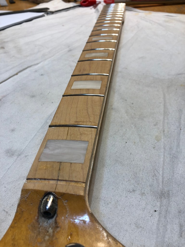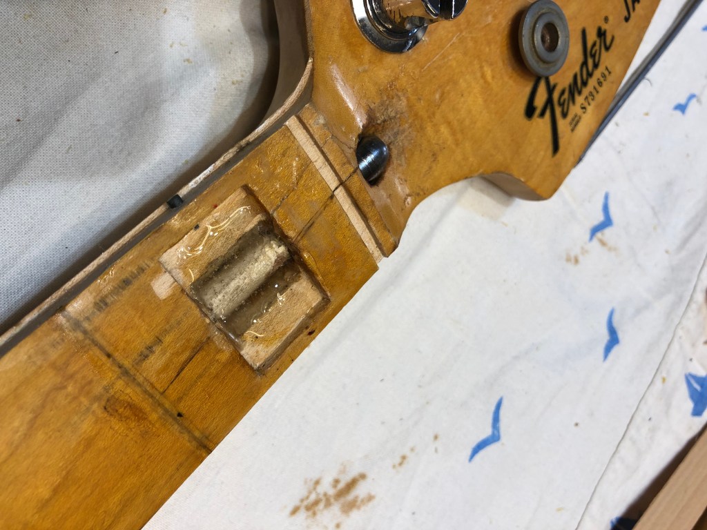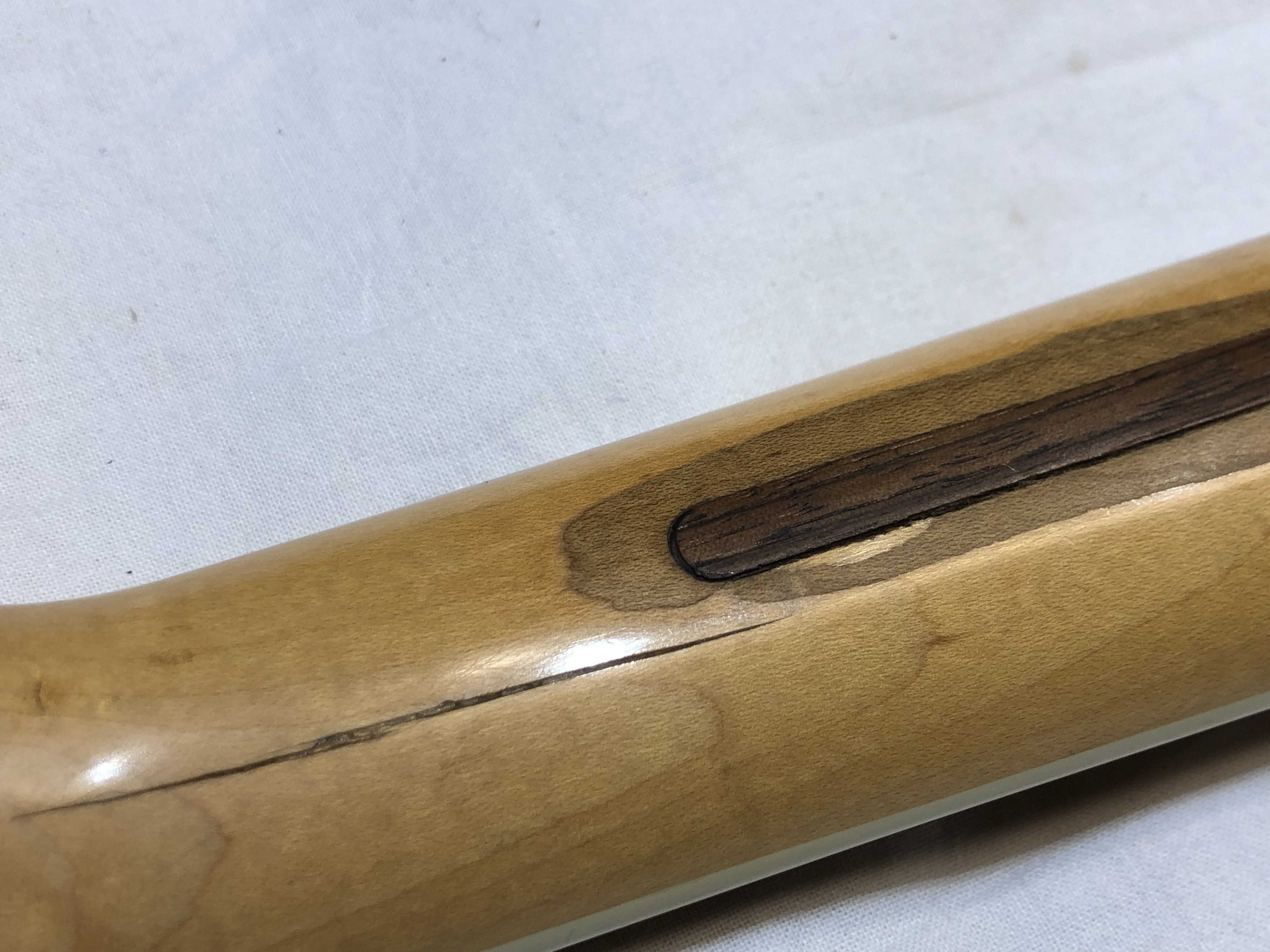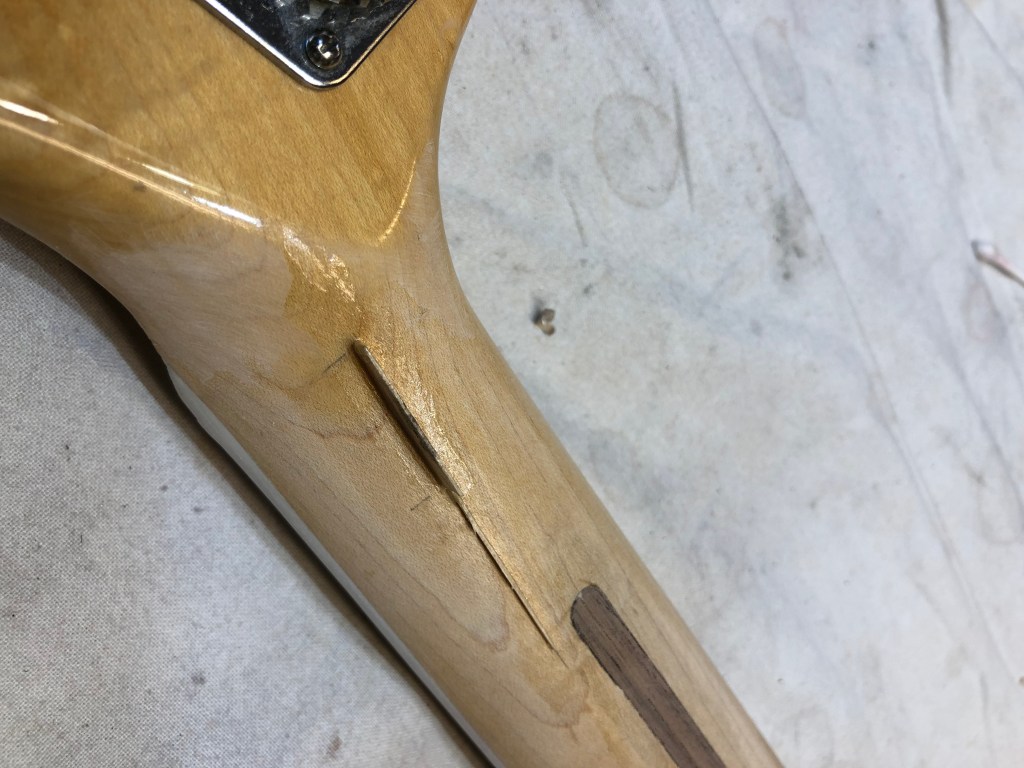Halkeaman korjaus saatiin mukavasti häivytettyä piiloon, kaula lakattiin PU-lakalla.