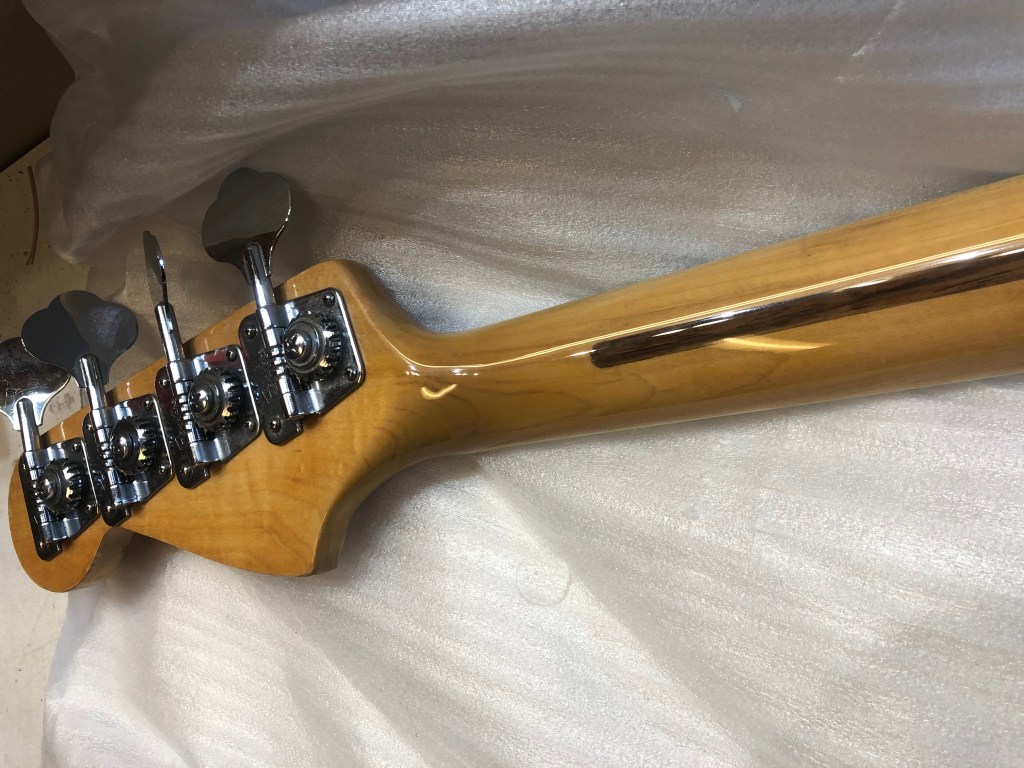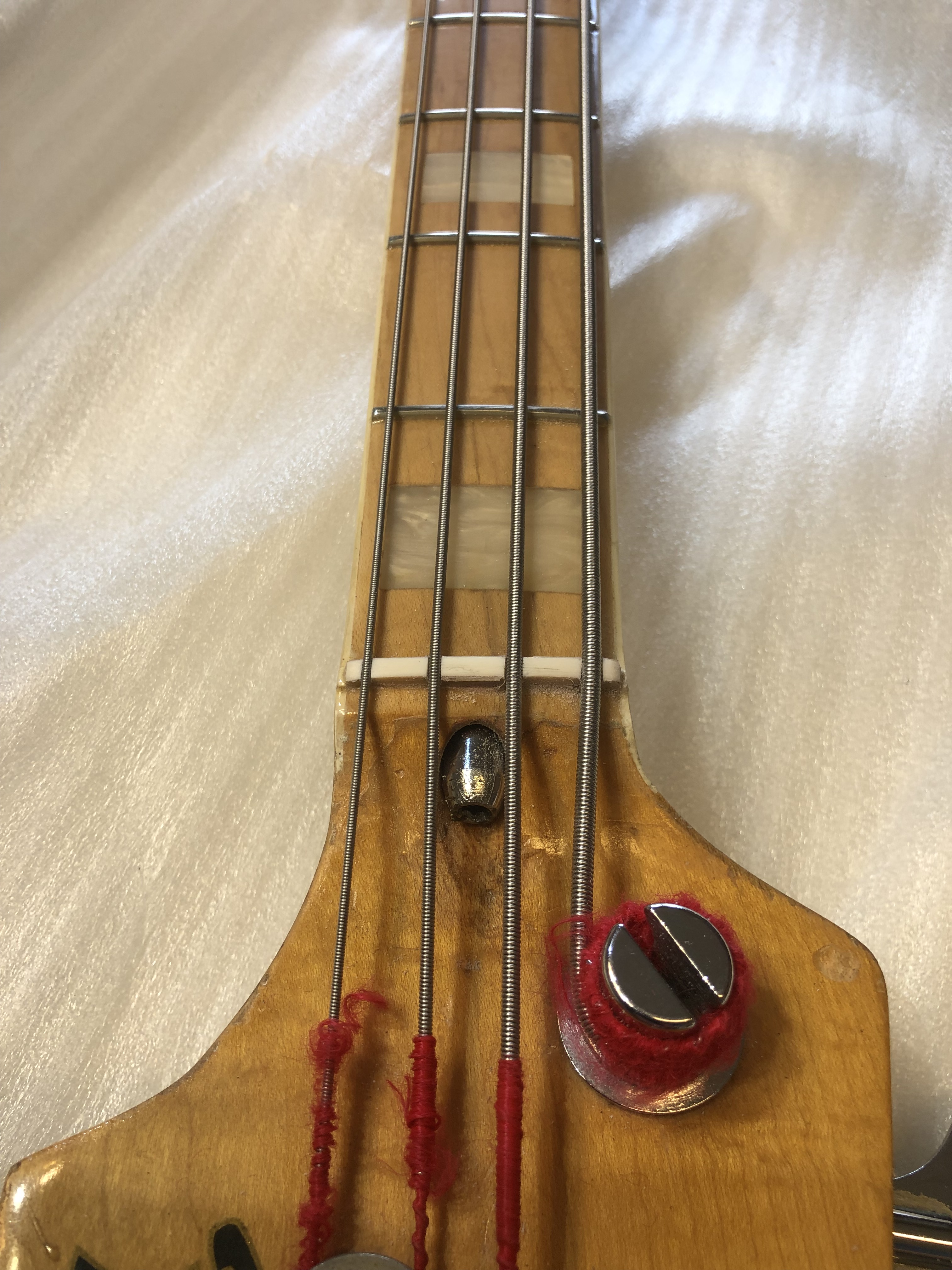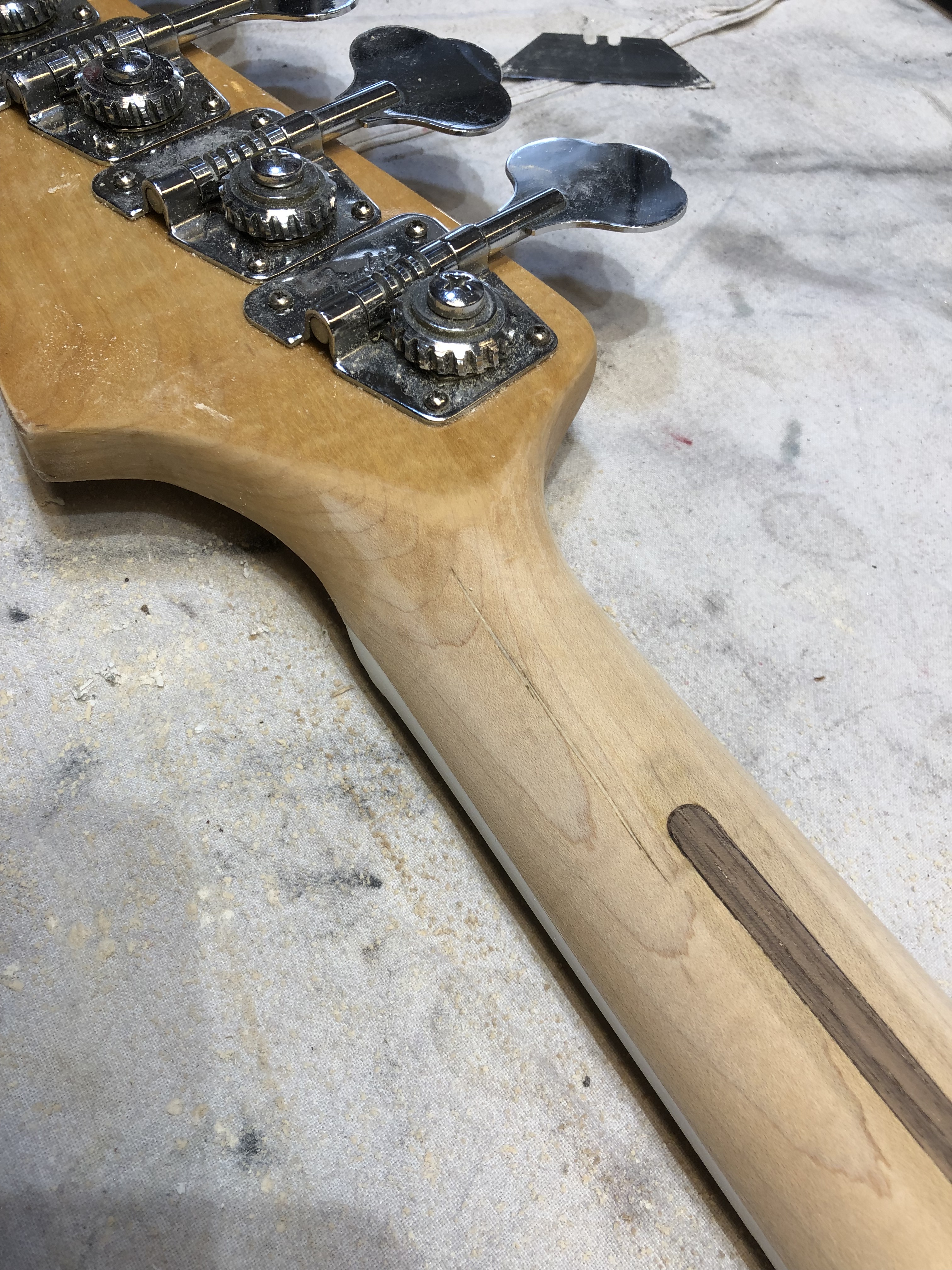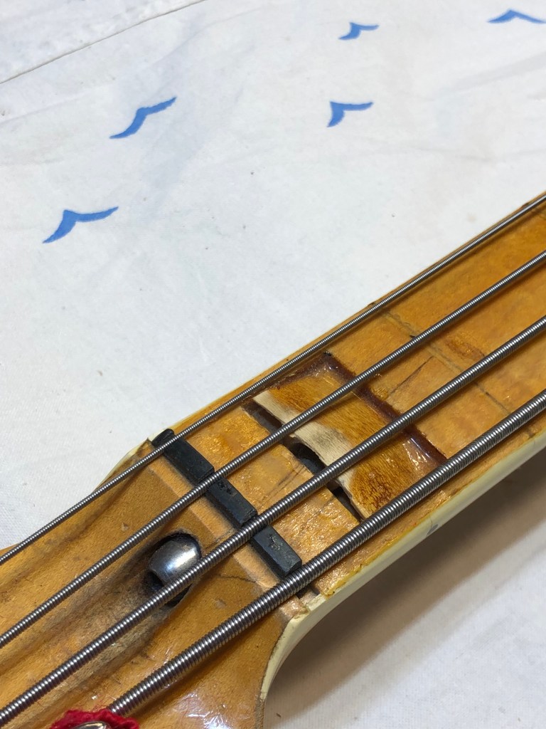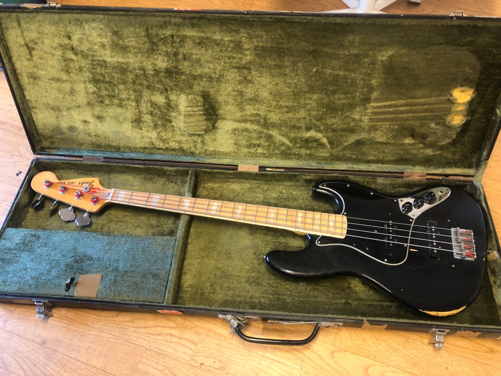 Tällä 77- Jazzbassolla oli takananna pikä ja vaiherikas elämä, nyt oltiin tilanteessa jossa tarvittiin ulkopuolista apua. Soittimesta oli jossain vaiheessa tehty nauhaton, nauhaurat oli täytetty sahanpuru-liimamössöllä tahi jollain muulla mömmöllä. Kaula oli tämän seurauksena tullutliian joustavaksi ja mennyt notkolle. Ongelmaa oli yritetty korjata kaularautaa kiristämällä. Ja kiristämällä. Jne. Liika kiristäminen oli aiheuttanut sen, että rauda pää oli alkanut vääntää kaulan puuta rikki. Otelautamerkki oli irronnut. Kaula oli profiililtaan kaaripyssymäinen.