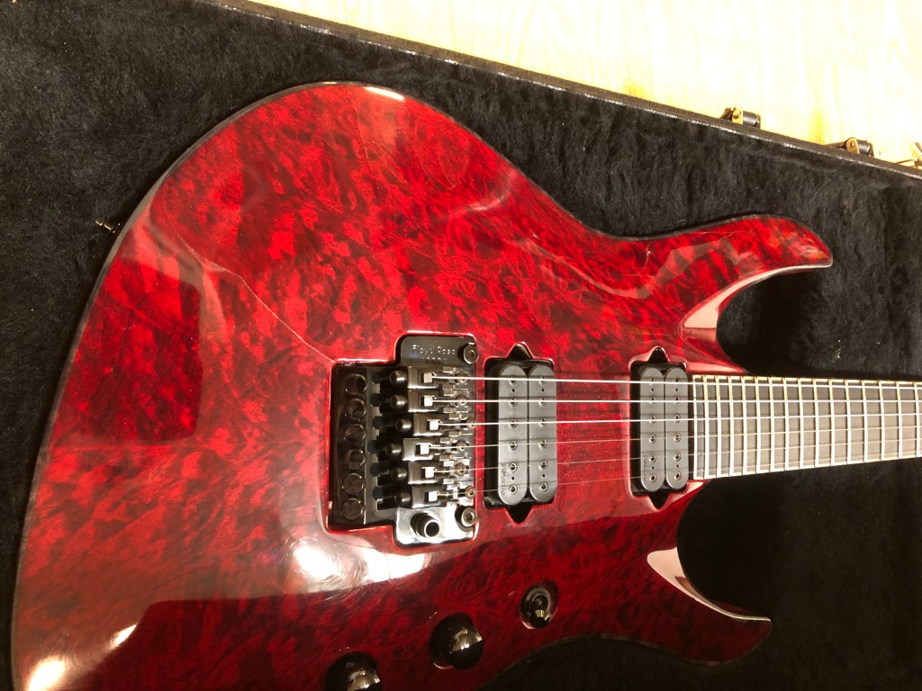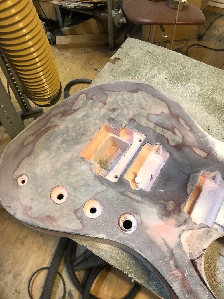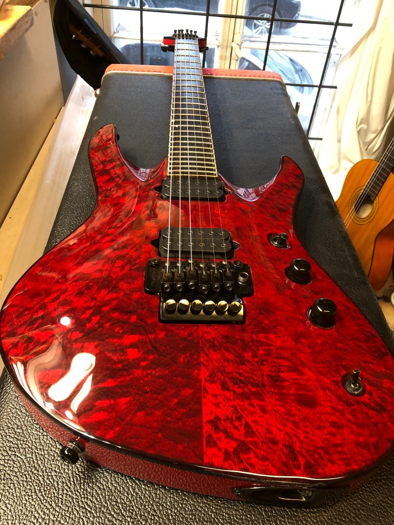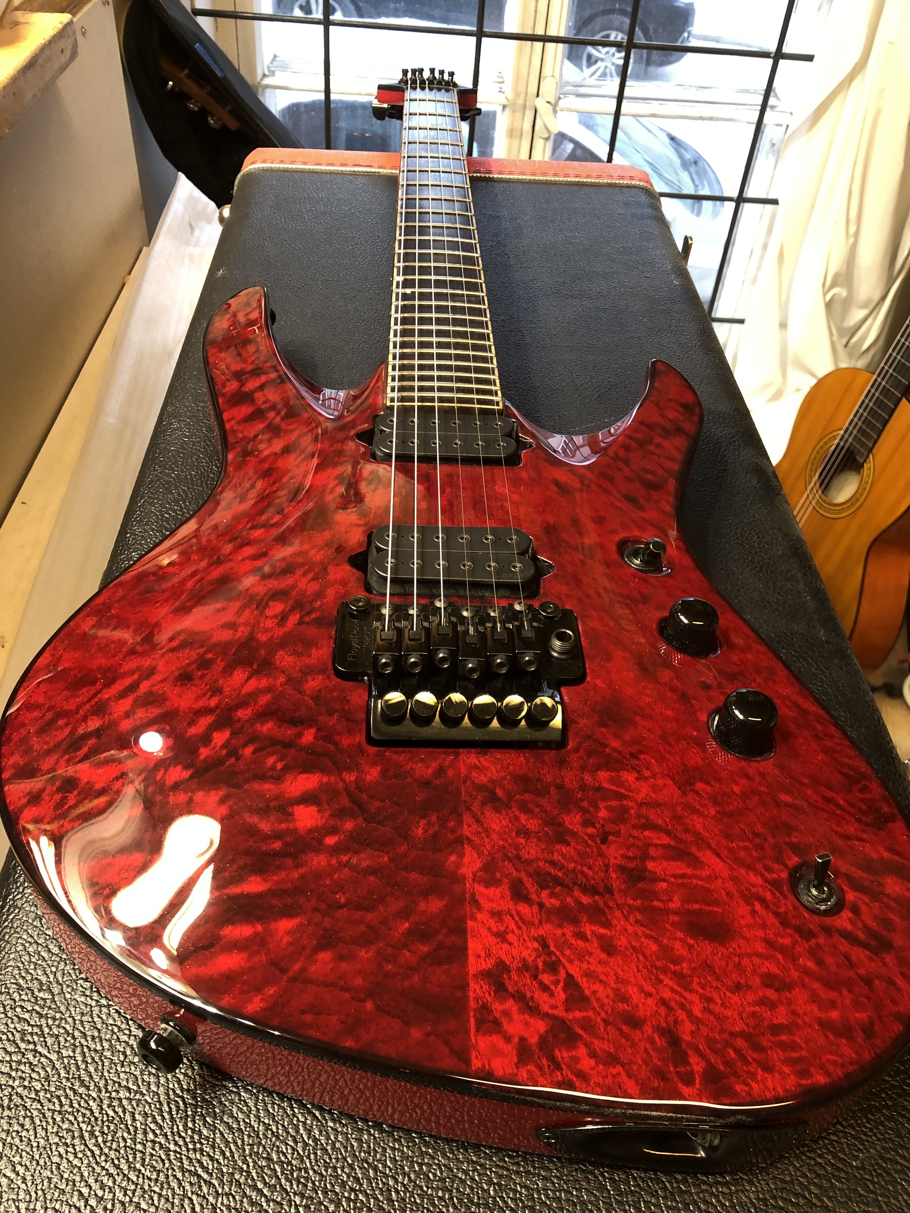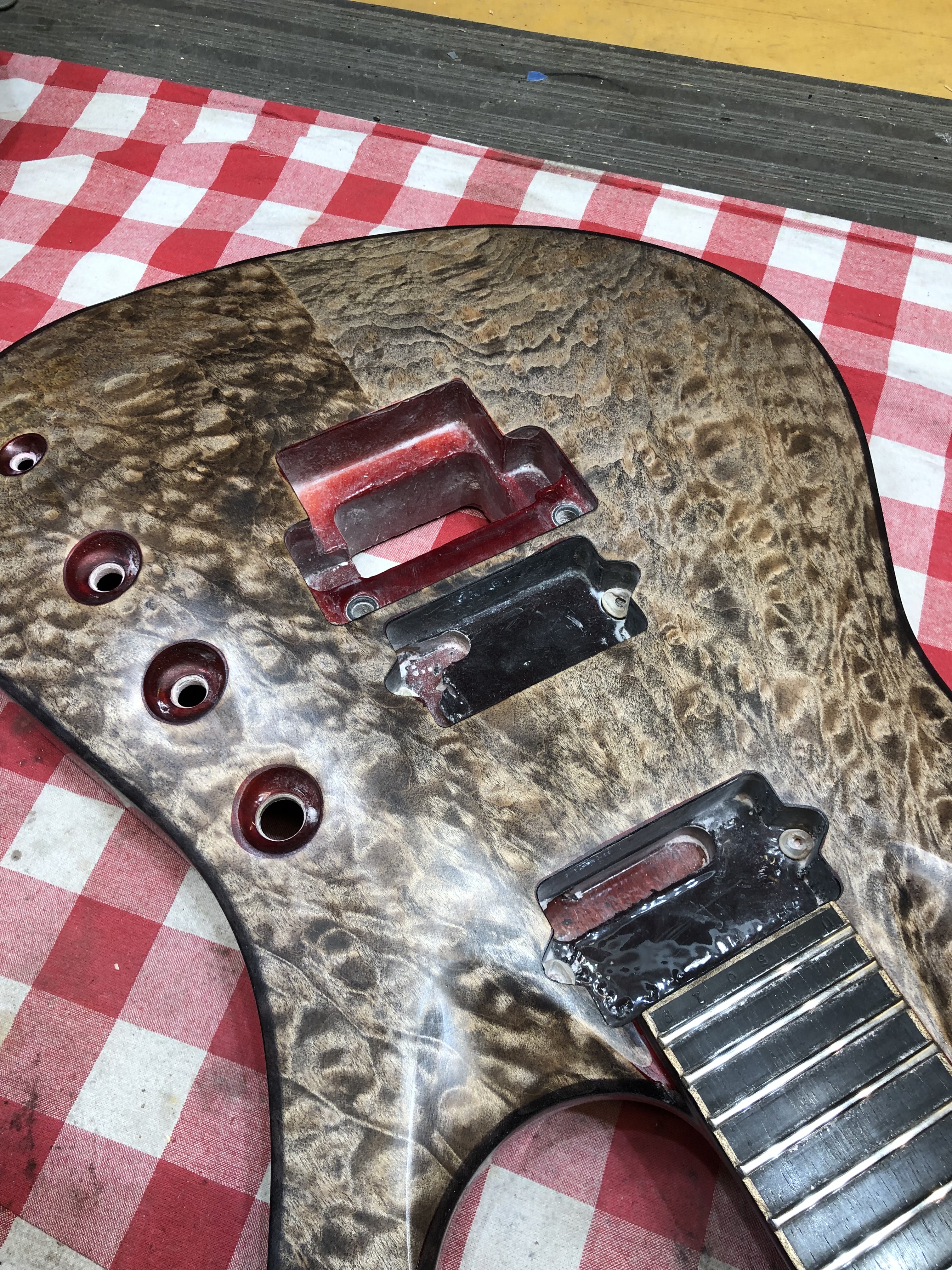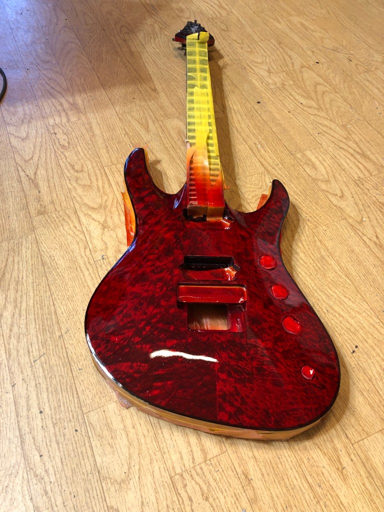 Kitarassa on loimuvaahterakansi joka on aluksi petsattu mustalla, sitten pinta on hiottu jolloin loimukuvio korostuu. Myös reunalista on tehty petsaamalla. Tässä kuvassa siis pintalakka ja punainen väri on poistettu, alkuperäinen pohjaväri on tallella värittömän lakkakerroksen alla.