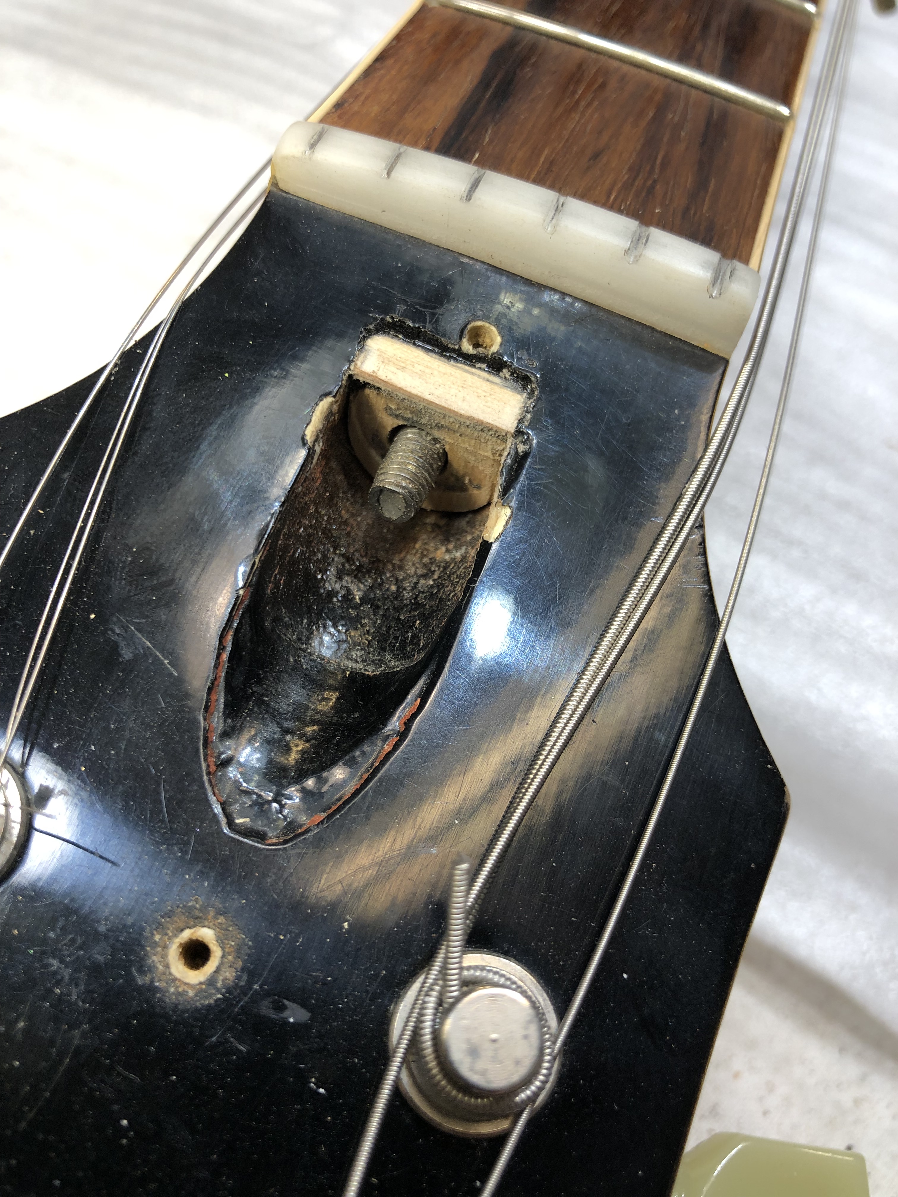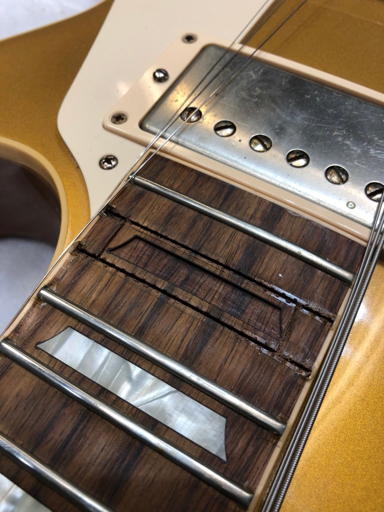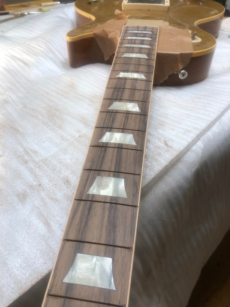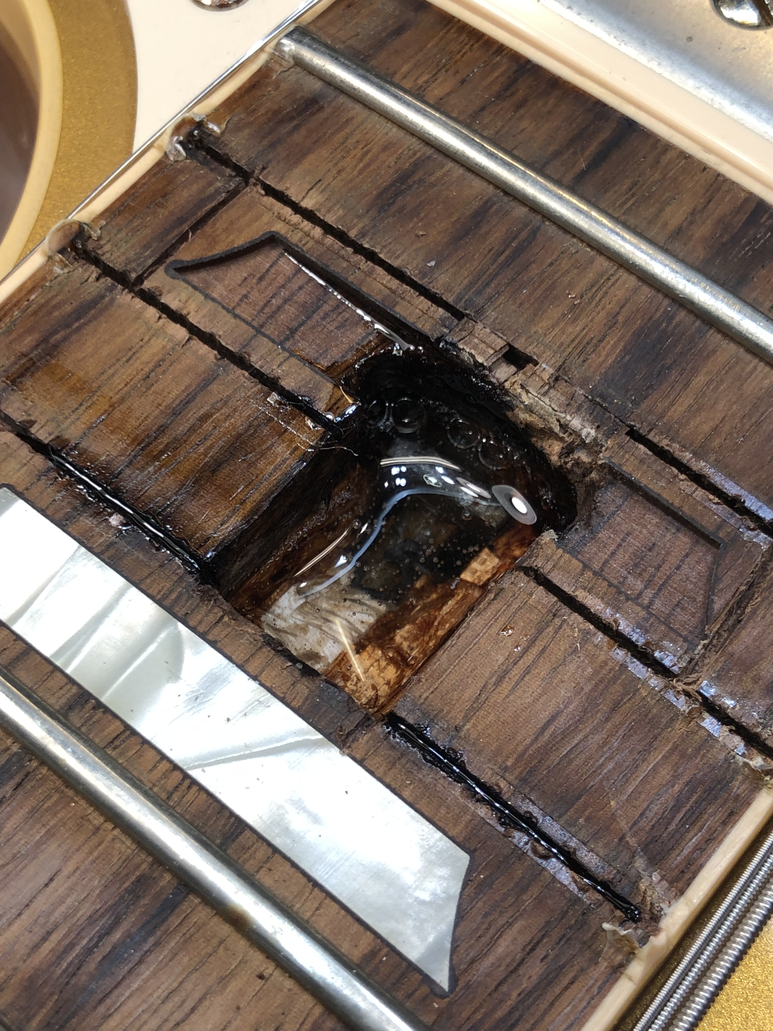 Korjaus aloitettiin poistamalla puuta mutterin päältä. Näissä historic-malleissa lapaviilu on, kuten alkuperäisissä, mustaksi lakattua paatsamaa (tai mikä lieneekään oikea suomenkielinen nimi, holly amerikaksi). Nykyäänhän Les Pauleissa käytetään mustaa kuitulevyä lapaviiluna.