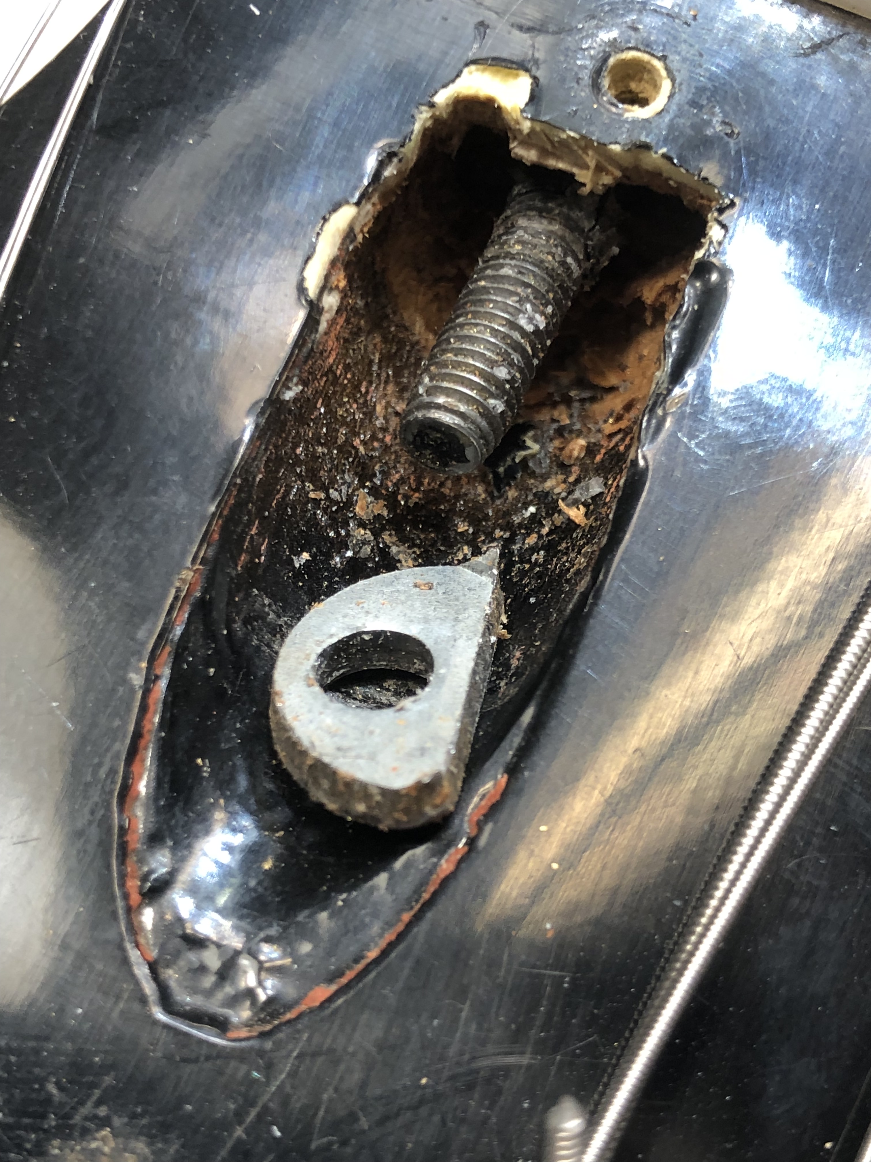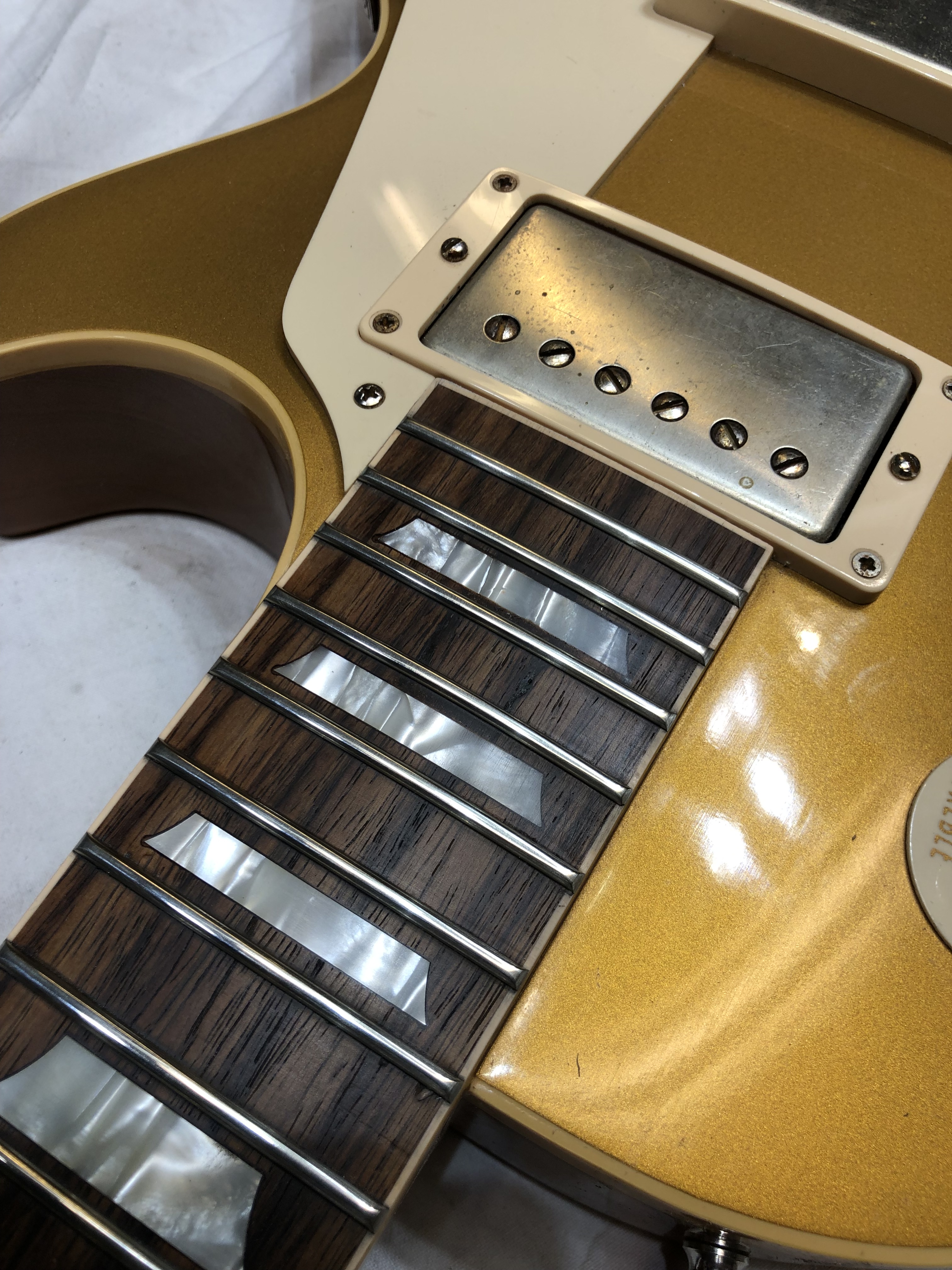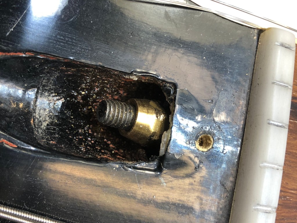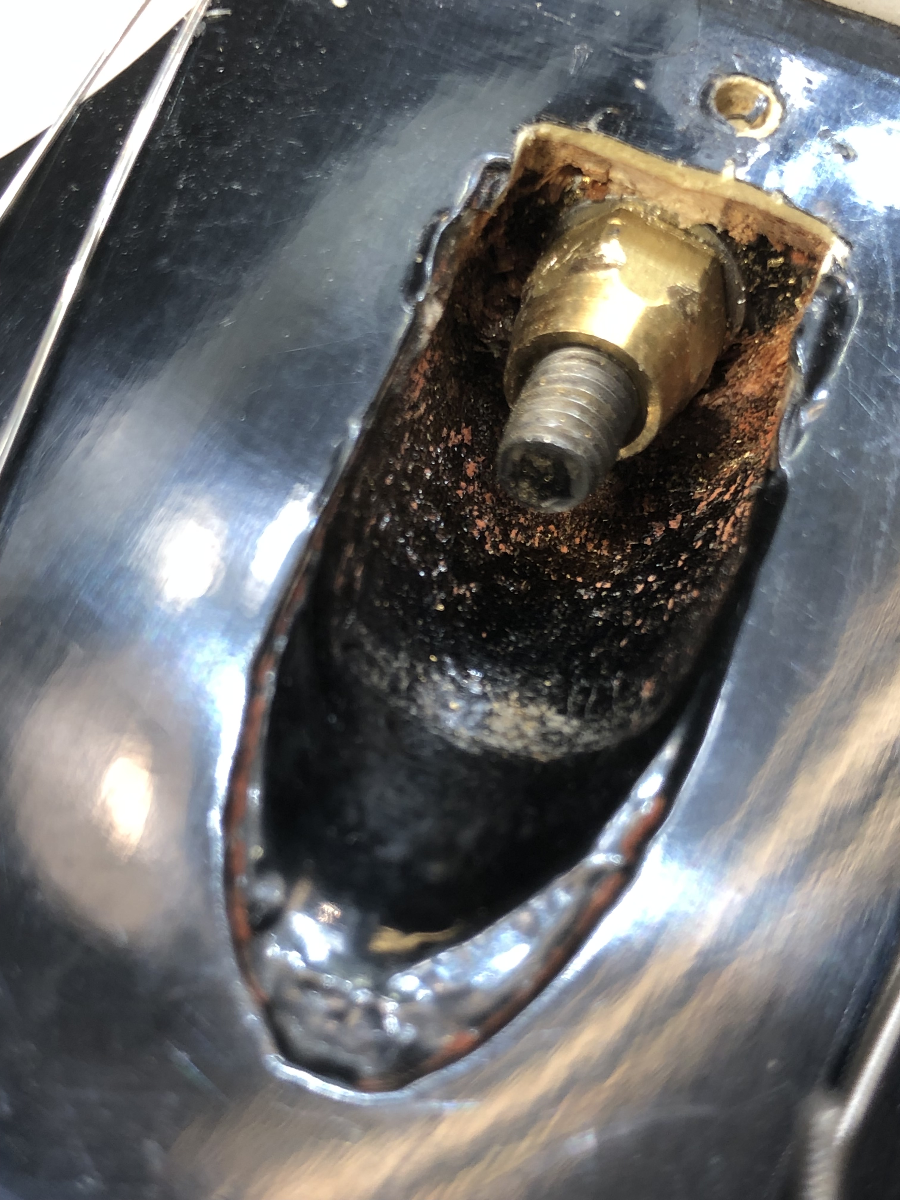 Korjaus aloitettiin poistamalla puuta mutterin päältä. Näissä historic-malleissa lapaviilu on, kuten alkuperäisissä, mustaksi lakattua paatsamaa (tai mikä lieneekään oikea suomenkielinen nimi, holly amerikaksi). Nykyäänhän Les Pauleissa käytetään mustaa kuitulevyä lapaviiluna.